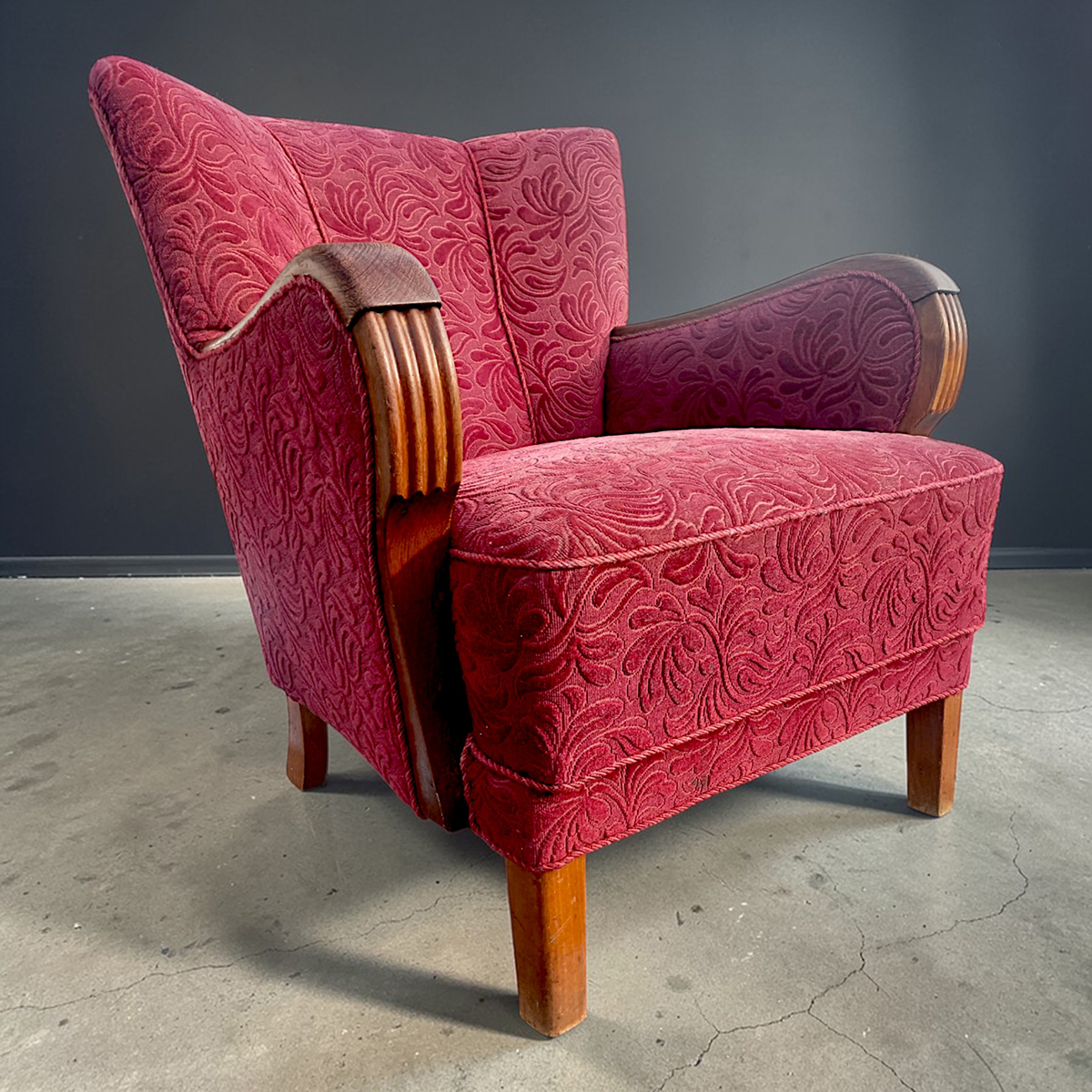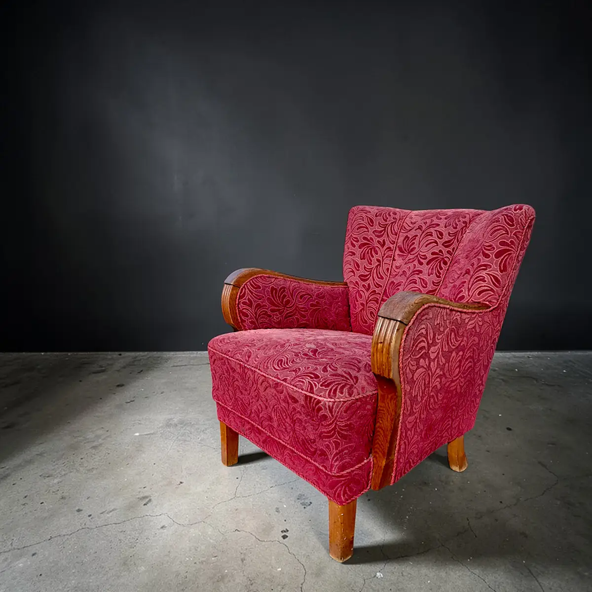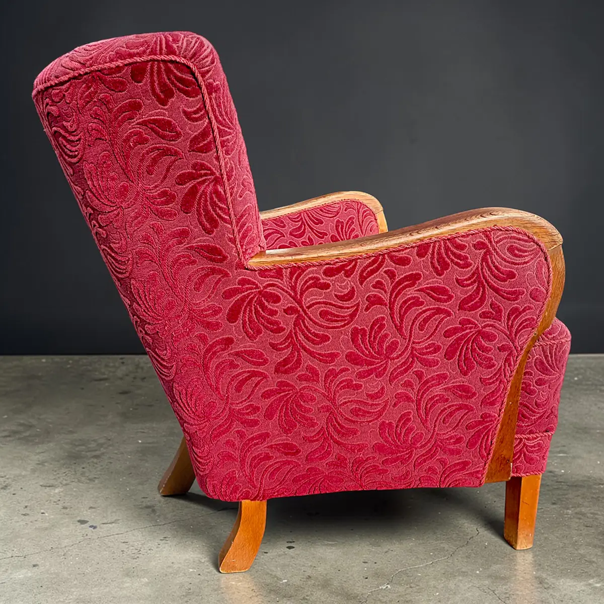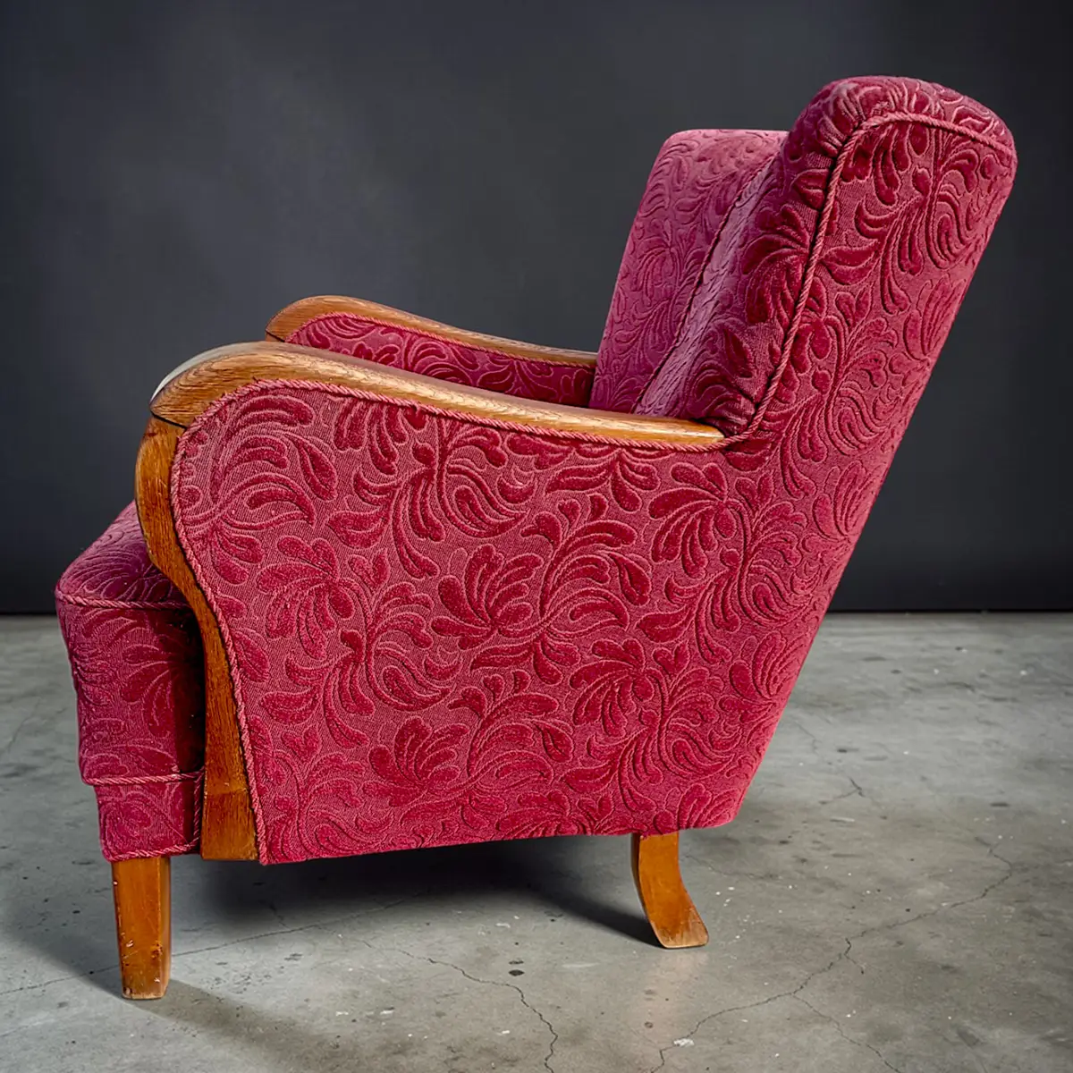 Solid og karakterfuld dansk lænestol fra omkring 1940’erne udført i klassisk snedkerarbejde med markante armlæn i bejdset eg og ben i bøg. Stolen er overpolstret og betrukket med et mønstret velourstof i dyb rød nuance, der giver et varmt og dekorativt udtryk.