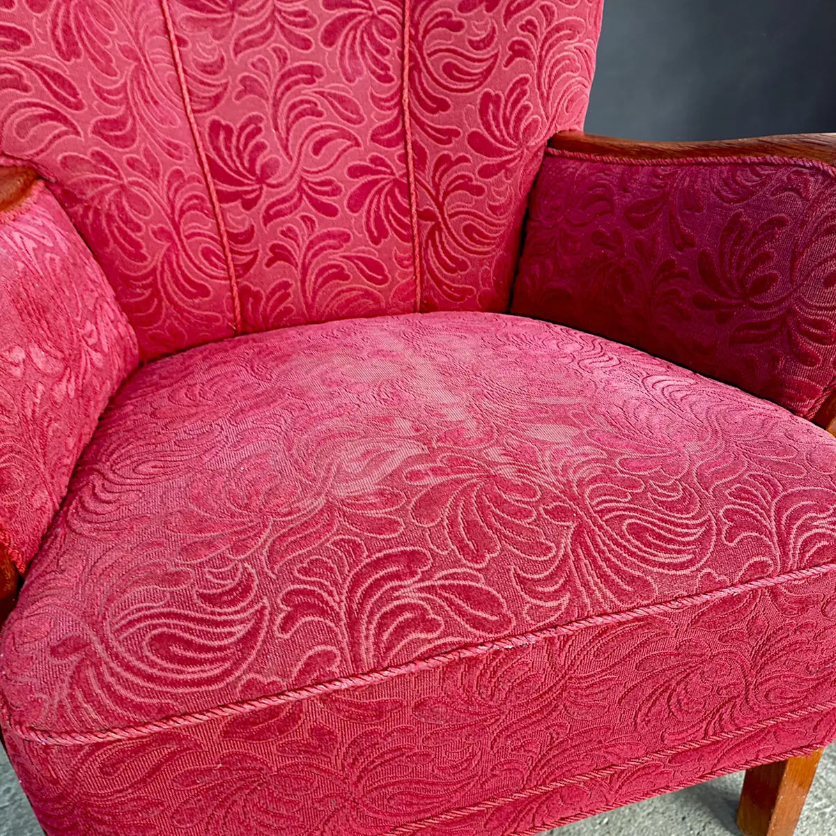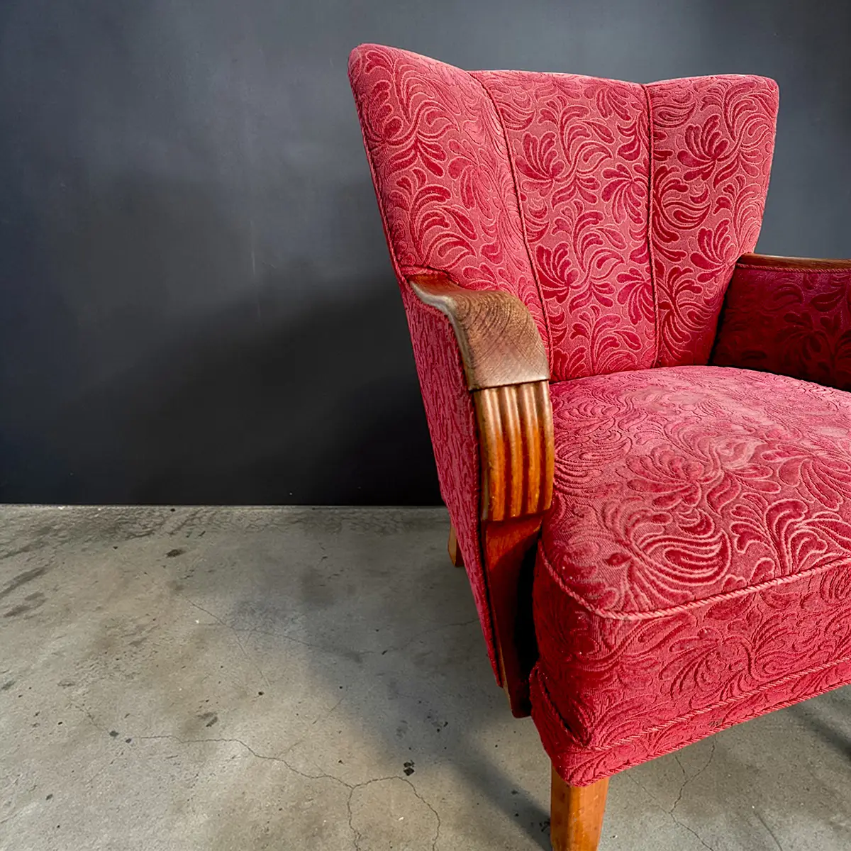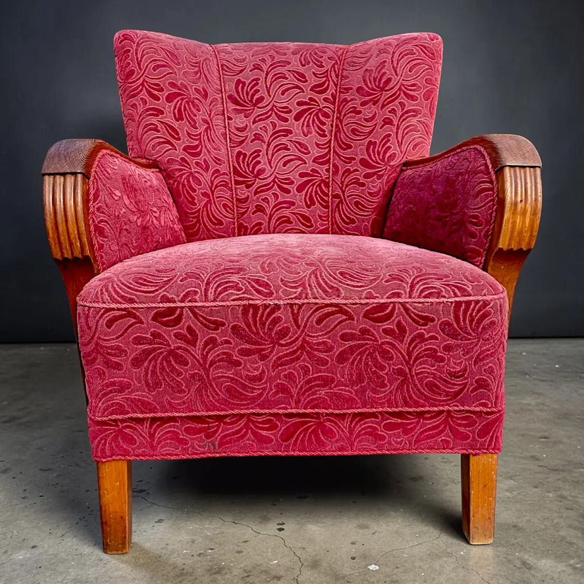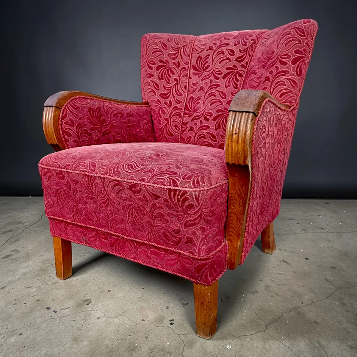 Solid og karakterfuld dansk lænestol fra omkring 1940’erne udført i klassisk snedkerarbejde med markante armlæn i bejdset eg og ben i bøg. Stolen er overpolstret og betrukket med et mønstret velourstof i dyb rød nuance, der giver et varmt og dekorativt udtryk.