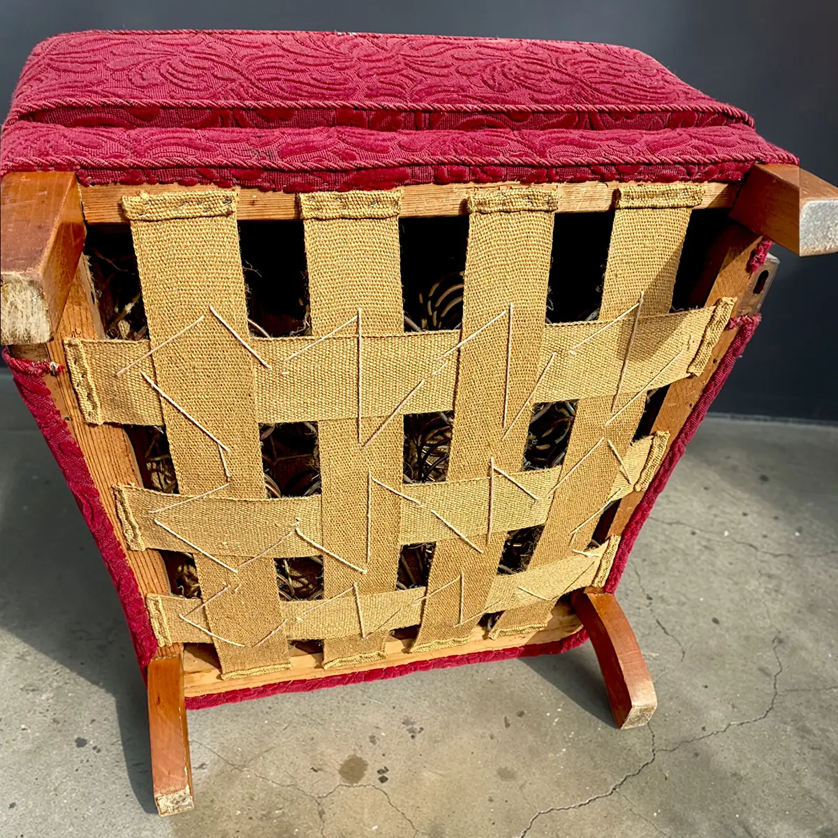 Stolen fremstår med almindelige brugsspor efter alder, herunder mærker på stellet og let slitage på polstringen, hvilket er forventeligt for en stol fra perioden.