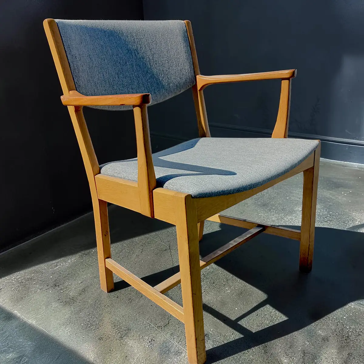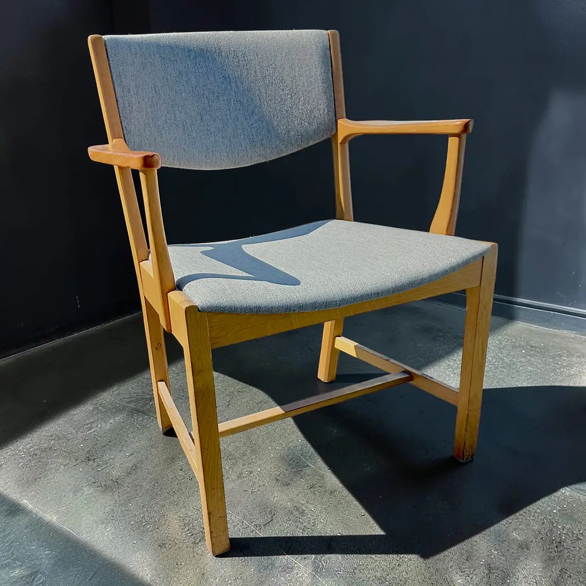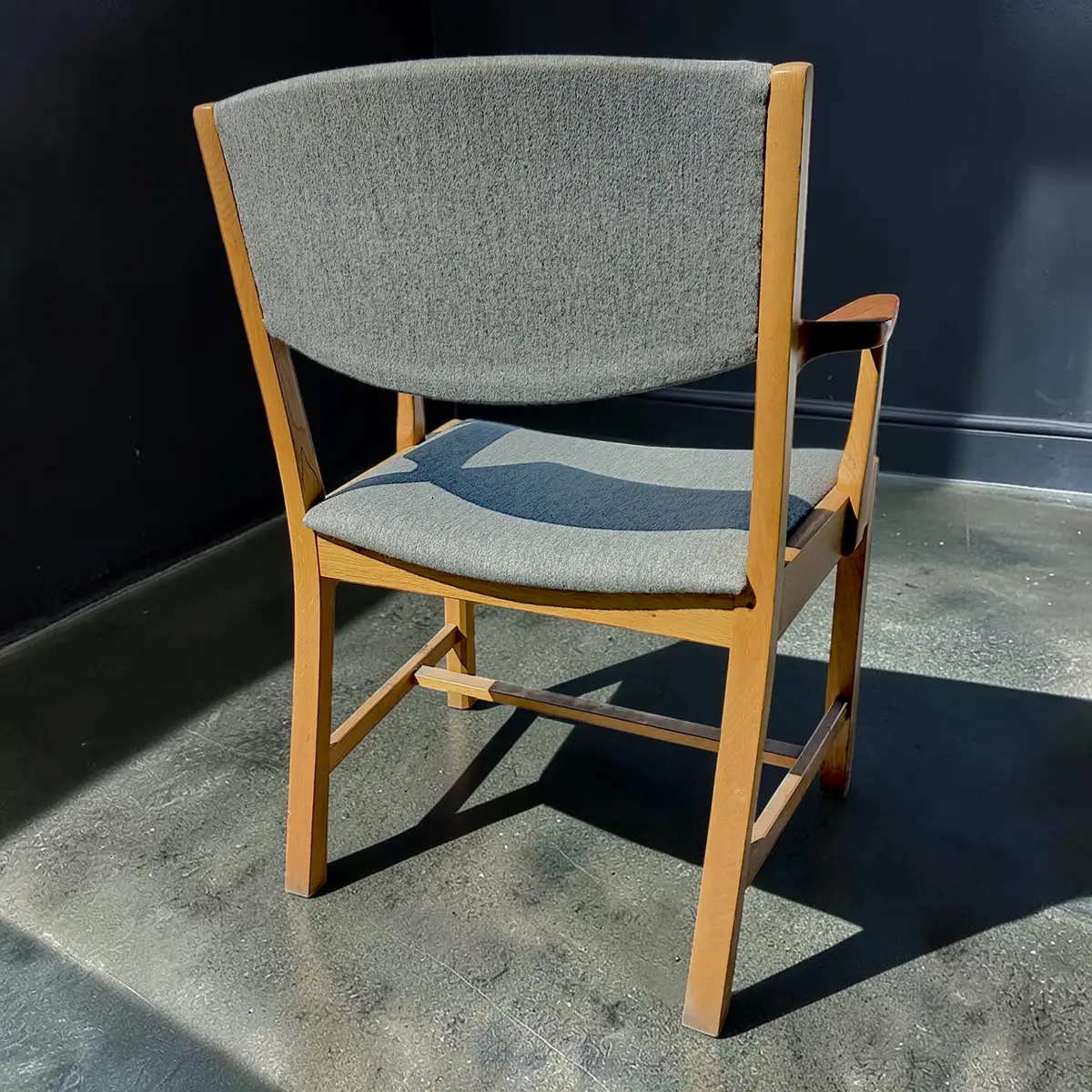 Stolen er udført i massiv eg med elegante armlæn i teak – en eftertragtet materialekombination, der tilfører varme og dybde til udtrykket. Det originale lysegrå uldbetræk fremstår usædvanligt velbevaret uden gennemsidninger eller huller. Stoffet har en tæt og robust struktur, der kvalitetsmæssigt kan minde om tekstiler fra eksempelvis Kvadrat, og bidrager væsentligt til stolens samlede udtryk