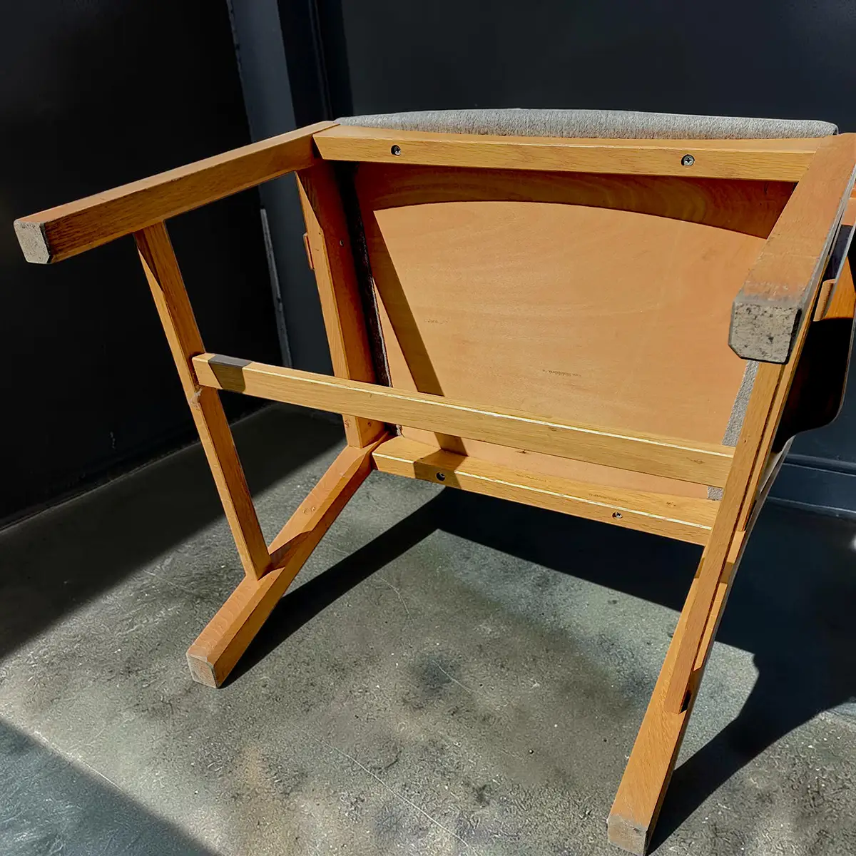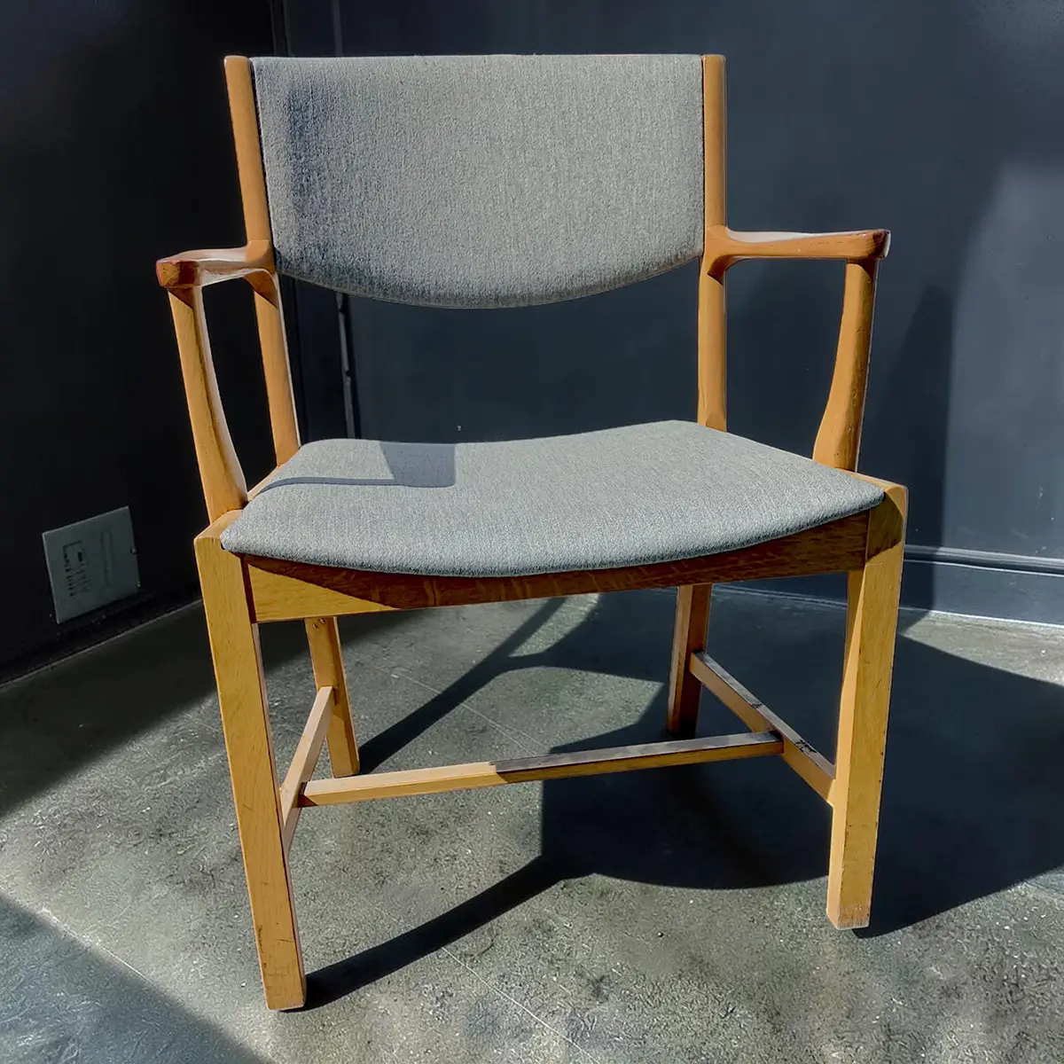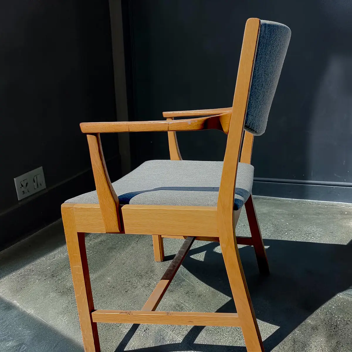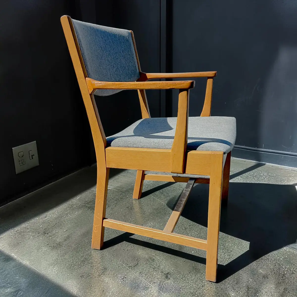 Stolen er udført i massiv eg med elegante armlæn i teak – en eftertragtet materialekombination, der tilfører varme og dybde til udtrykket. Det originale lysegrå uldbetræk fremstår usædvanligt velbevaret uden gennemsidninger eller huller. Stoffet har en tæt og robust struktur, der kvalitetsmæssigt kan minde om tekstiler fra eksempelvis Kvadrat, og bidrager væsentligt til stolens samlede udtryk