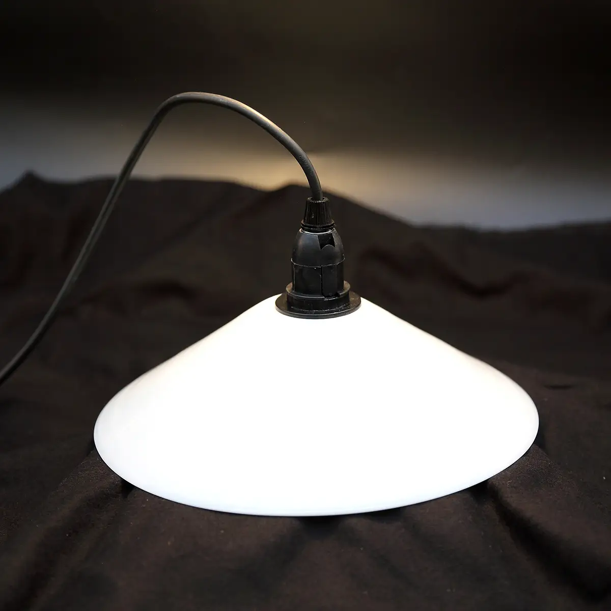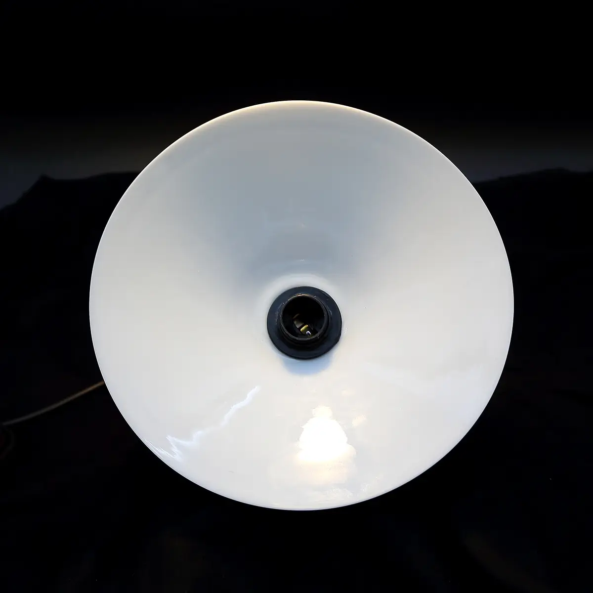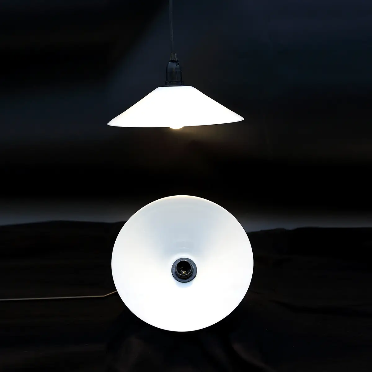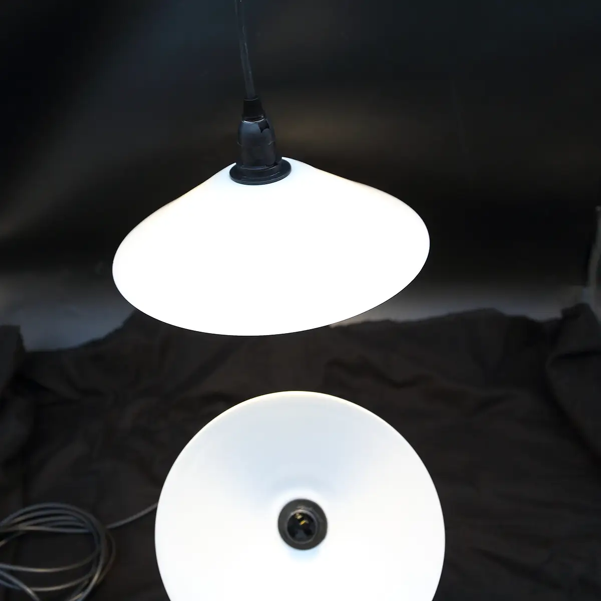 Sæt på to ens originale skomagerstil lampeskærme i mundblæst opalglas fra ca. 1930–40’erne. Skærmene er bevaret og opgraderet gennem upcycling og monteret med nye, tidssvarende el-komponenter, så de er klar til moderne brug.