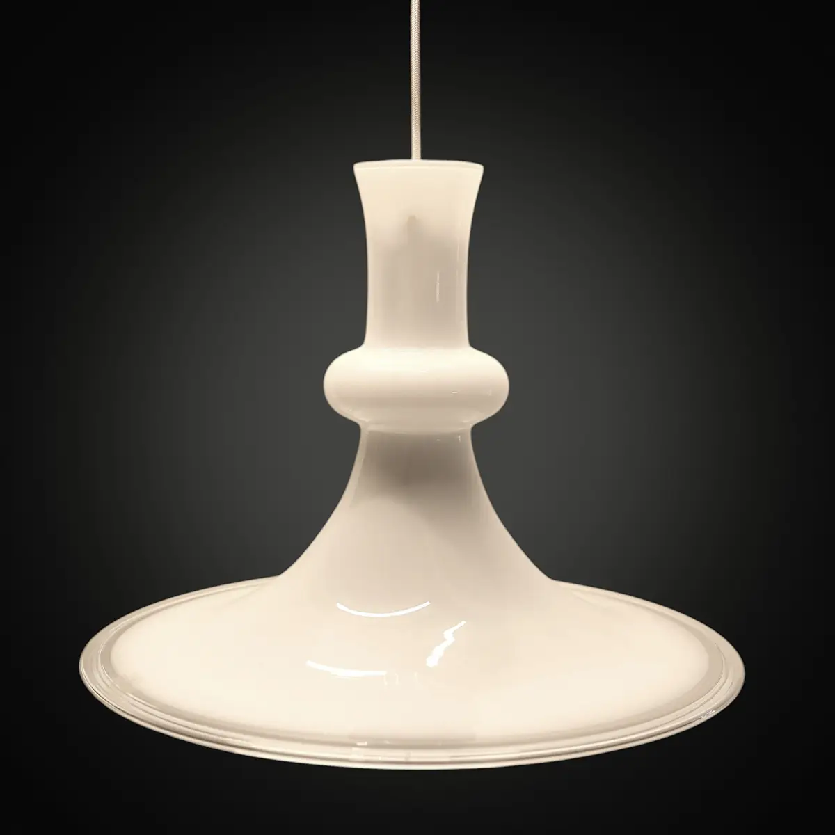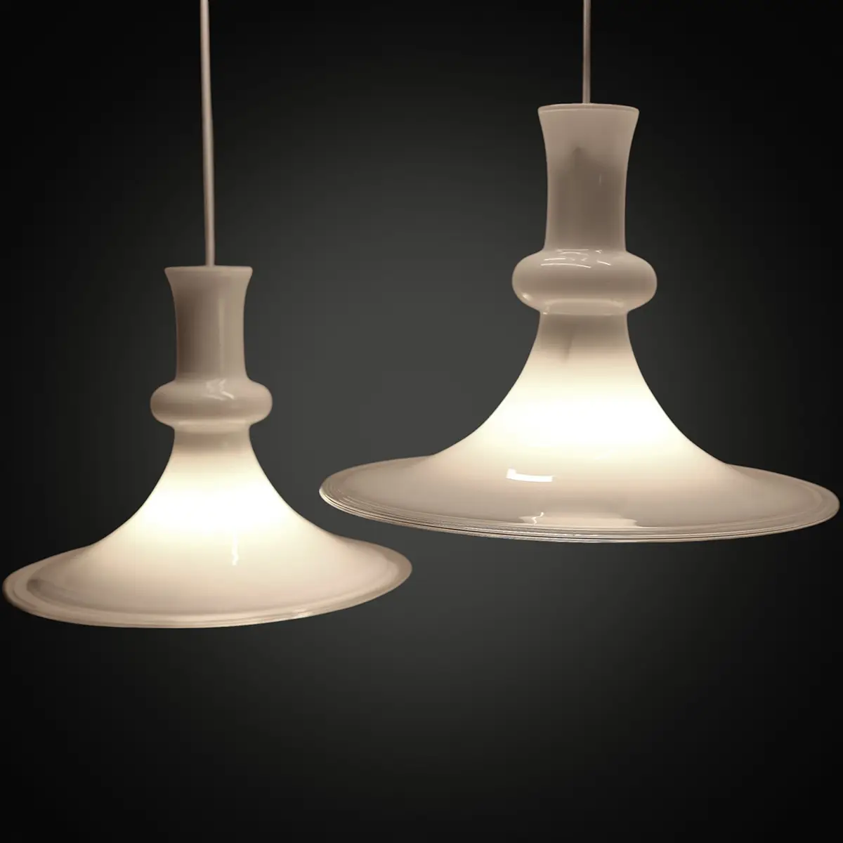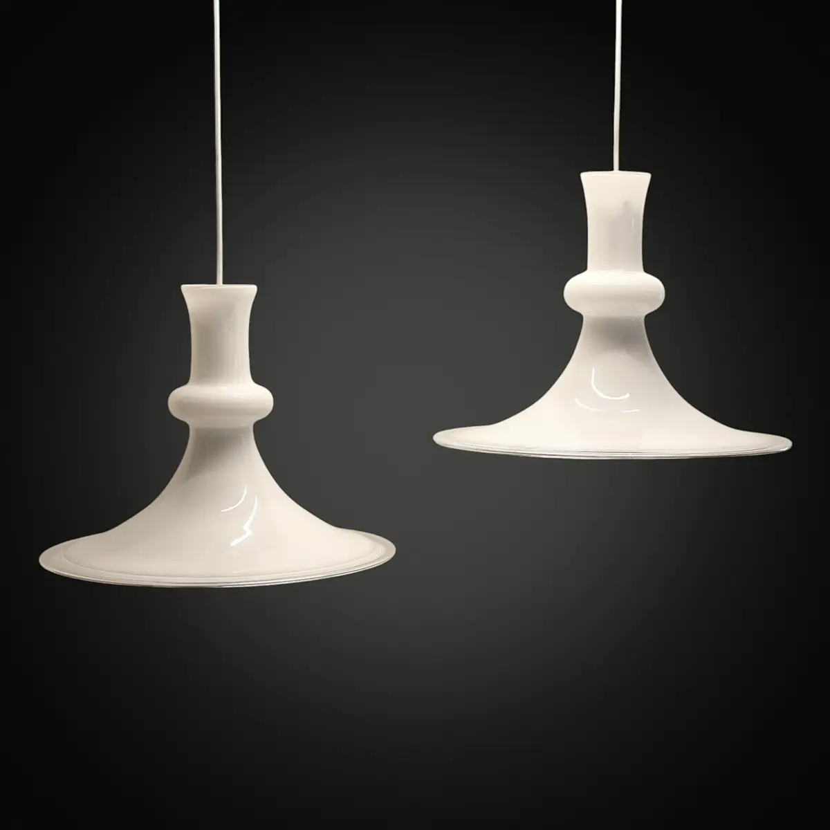 Smukt og harmonisk sæt store Etude-pendler designet af Michael Bang og udført i mundblæst hvidt opalglas med klar glasrand nederst. Modellen er produceret hos Holmegaard og distribueret gennem Royal Copenhagen i den periode, hvor de to navne var tæt forbundne.