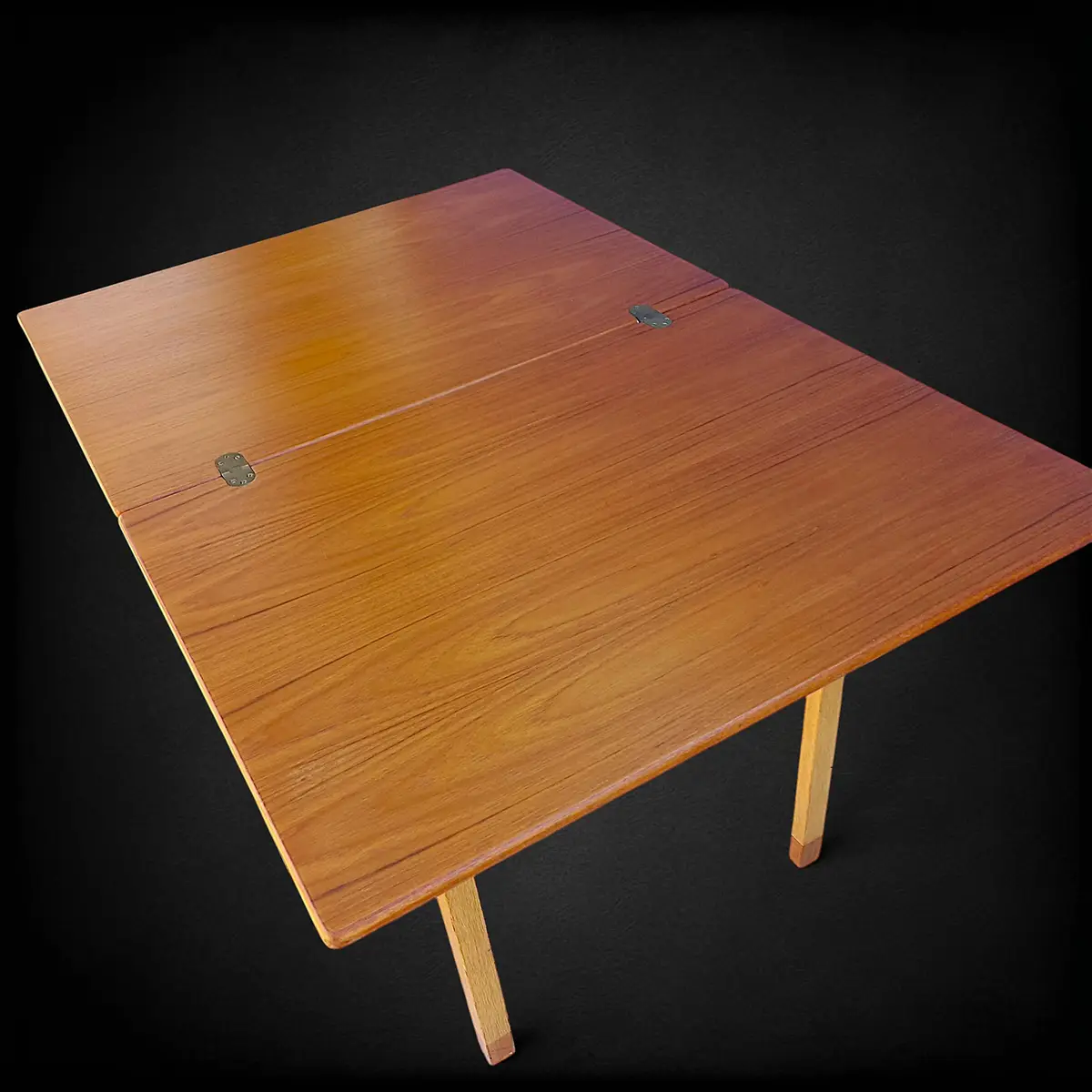 Et alsidigt og funktionelt multifunktionsbord i teakfinér og massivt egetræ, tilskrevet Ejner Larsen og produceret hos Næstved Møbelfabrik.