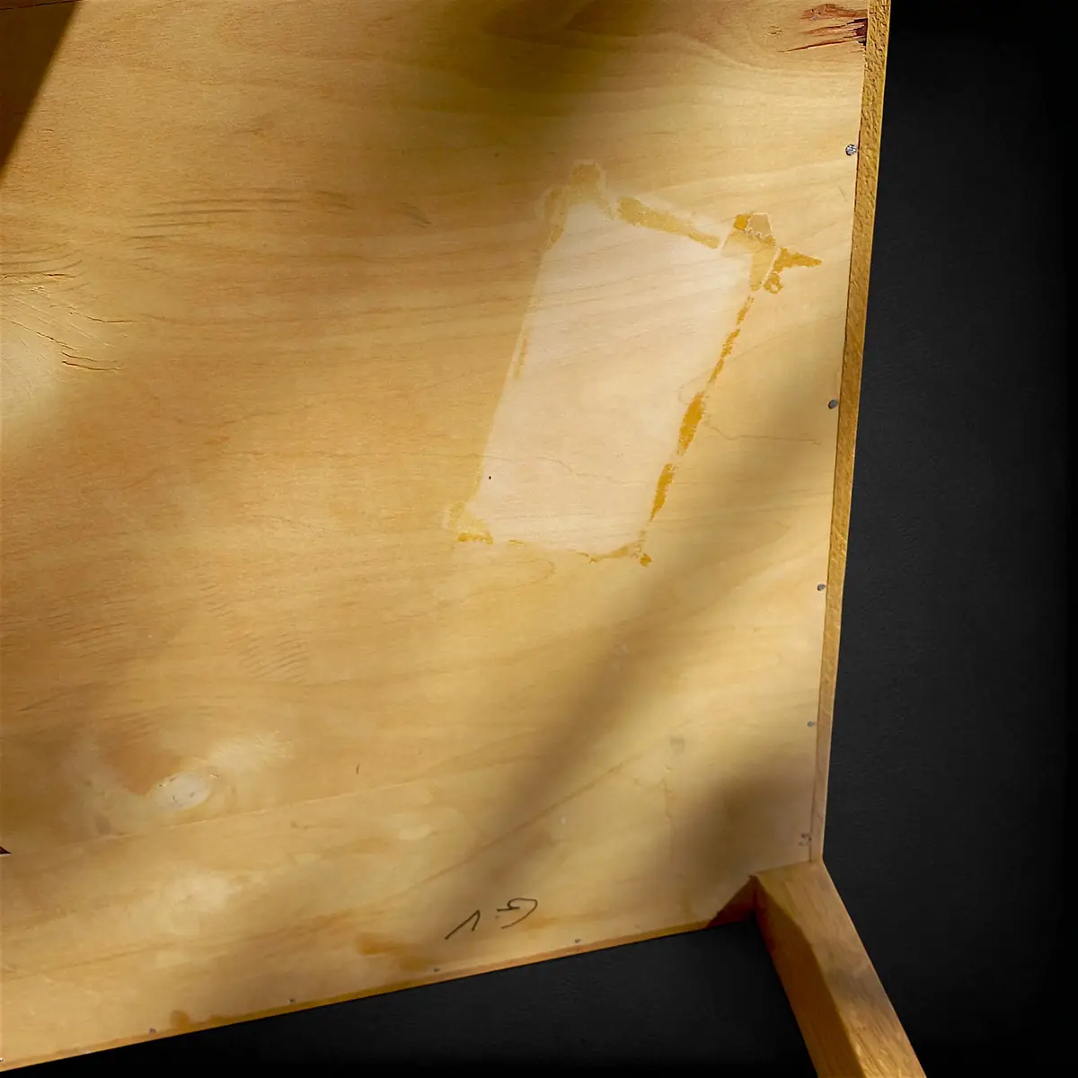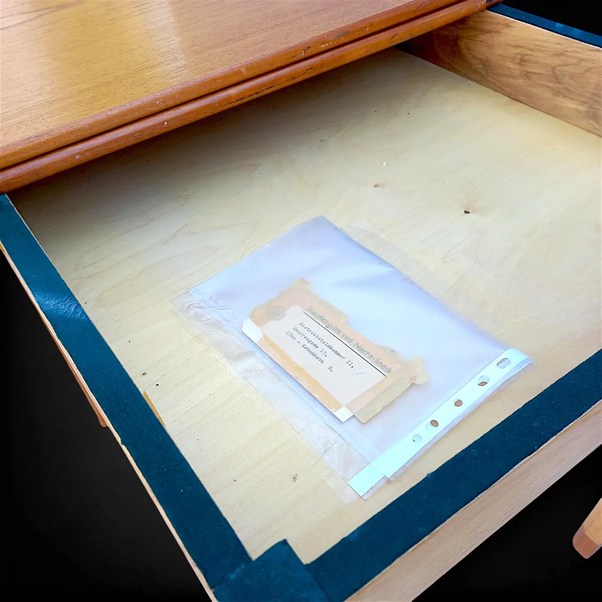 Det særlige ved dette eksemplar er den bevarede originale makat fra Statsfængslet ved Nørre Snede. Makatet har tidligere siddet fastgjort under bordet og er nu nænsomt bevaret separat, så det fortsat følger bordet som dokumentation for dets oprindelse. En sjælden detalje, der giver bordet både historie og autenticitet.