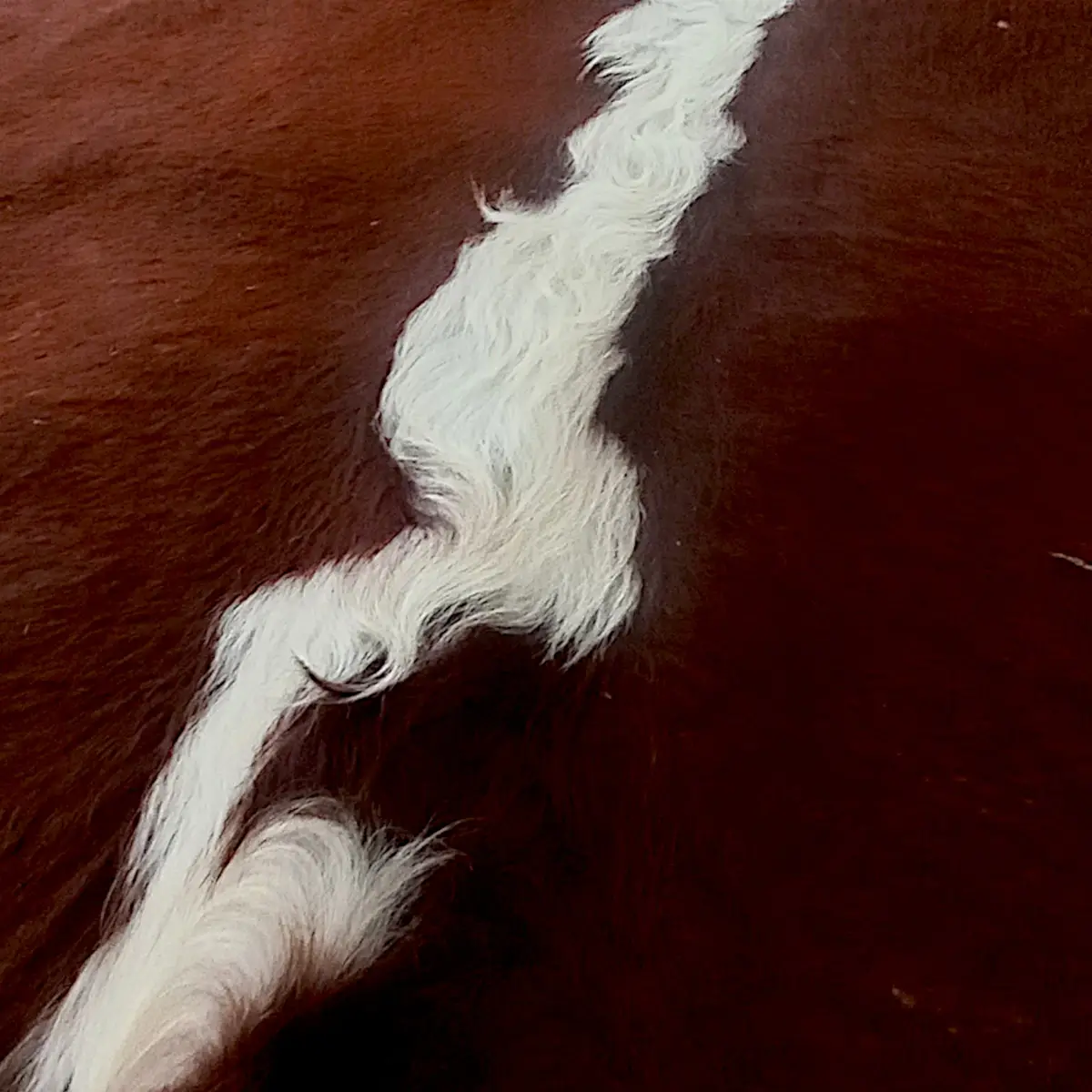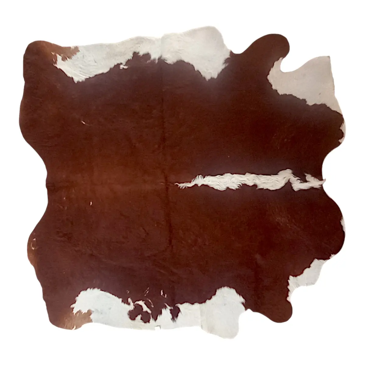 Stort, ægte koskind i naturlige brun- og hvide nuancer. Et markant og dekorativt skind med tydelig struktur og flot farvespil, velegnet som gulvtæppe, vægdekoration eller over sofa, bænk eller seng.