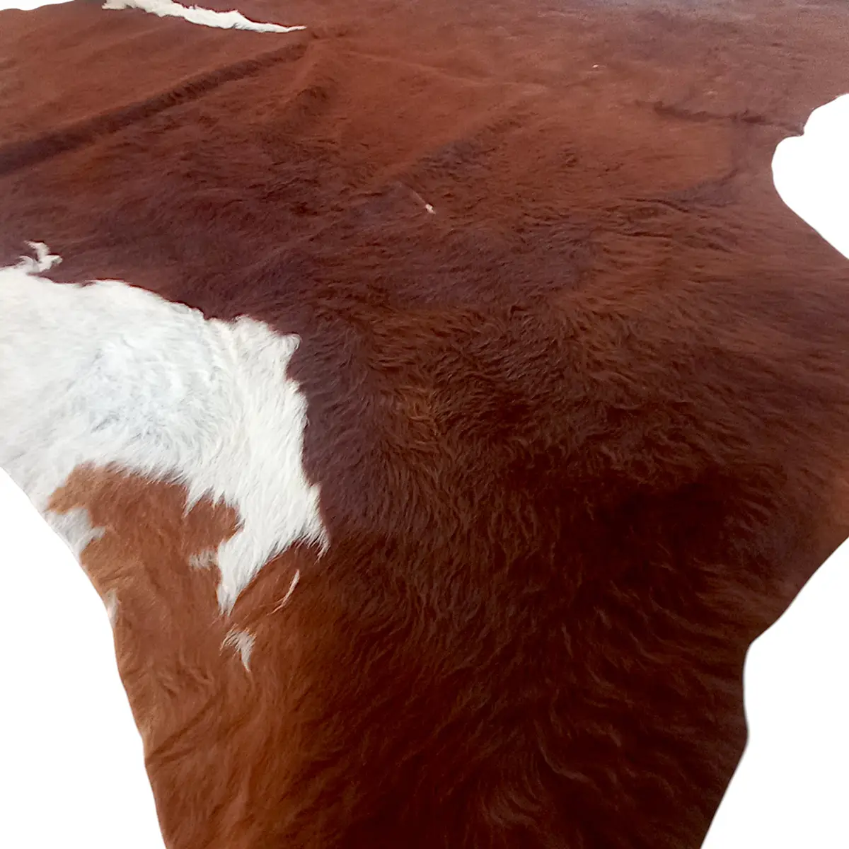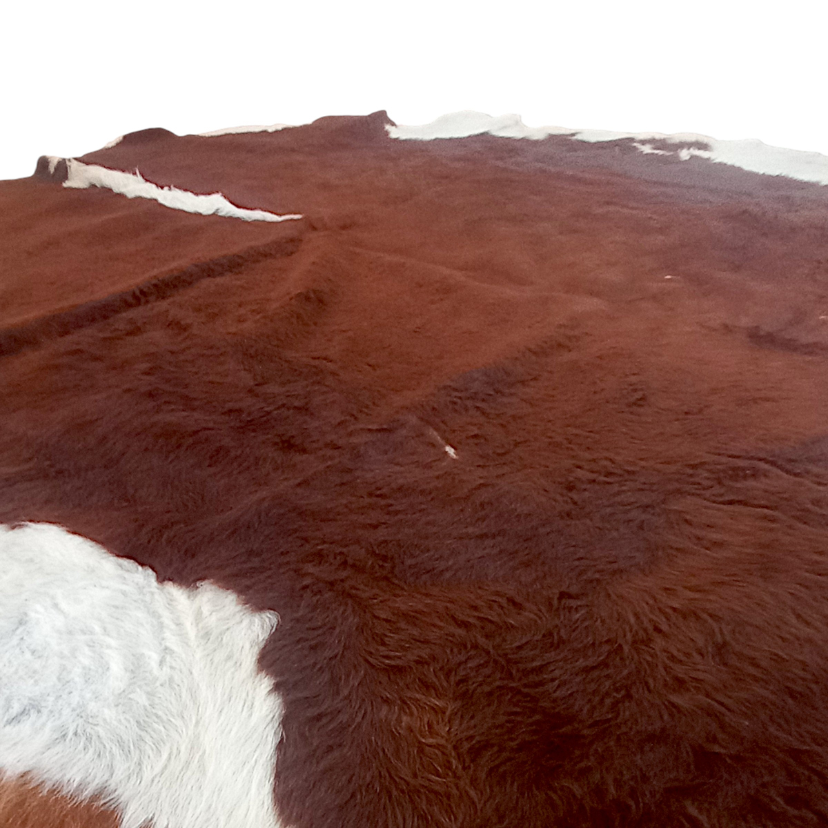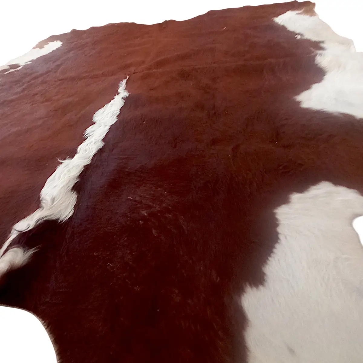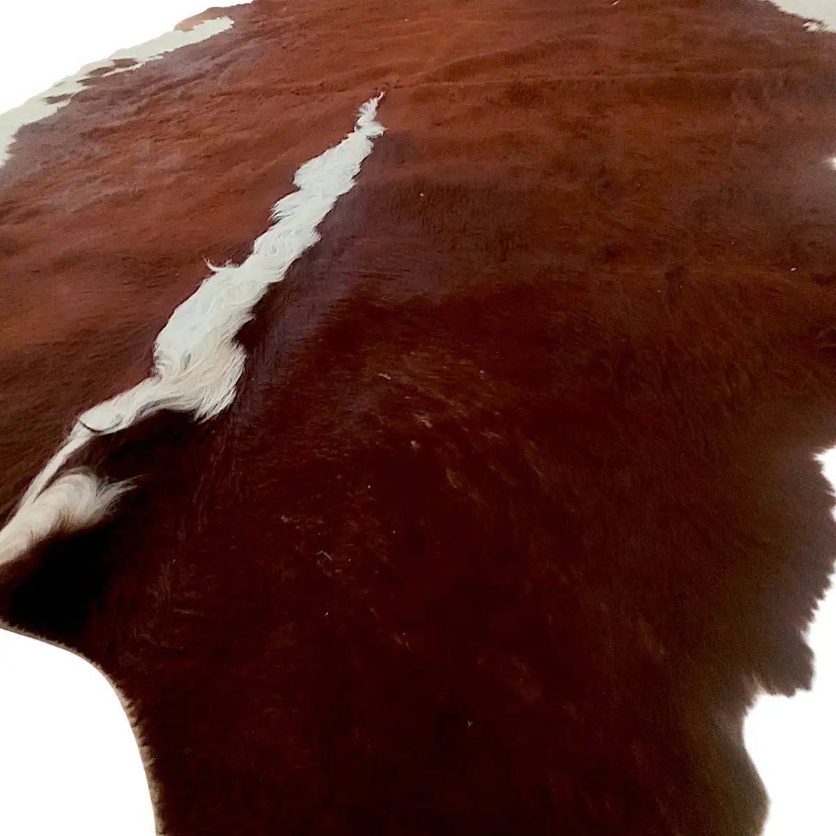 Skindet har en tæt og blød overflade med naturlige variationer, som man kun finder ved ægte koskind. Hvert skind er unikt – dette eksemplar skiller sig ud ved sin store størrelse og høje vægt, hvilket giver et eksklusivt og solidt udtryk i rummet.