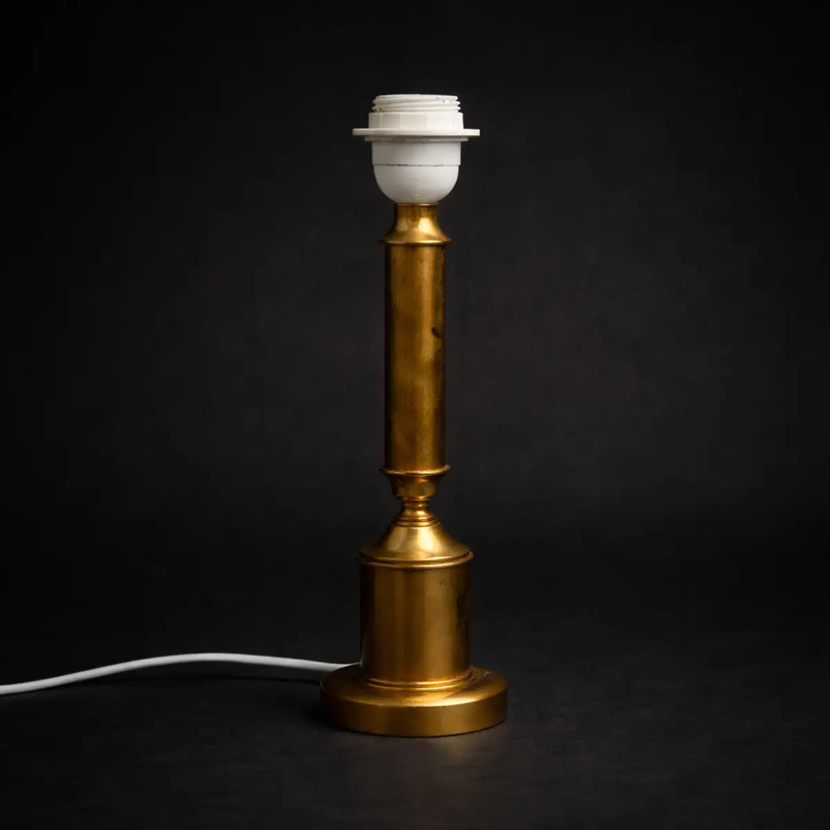 Elegant og velproportioneret bordlampe udført i massiv messing med smuk, naturlig patina. Den slanke, næsten søjleformede opbygning og den balancerede fod giver lampen et roligt og arkitektonisk udtryk, som klæder både klassiske teakmiljøer og mere nutidig, afdæmpet indretning.