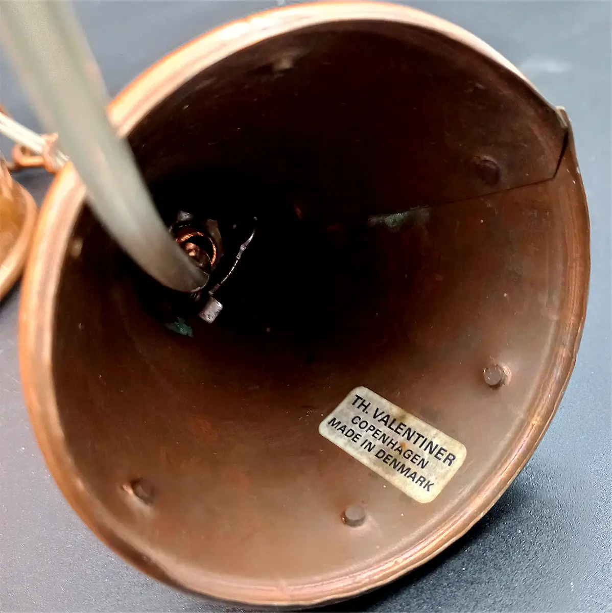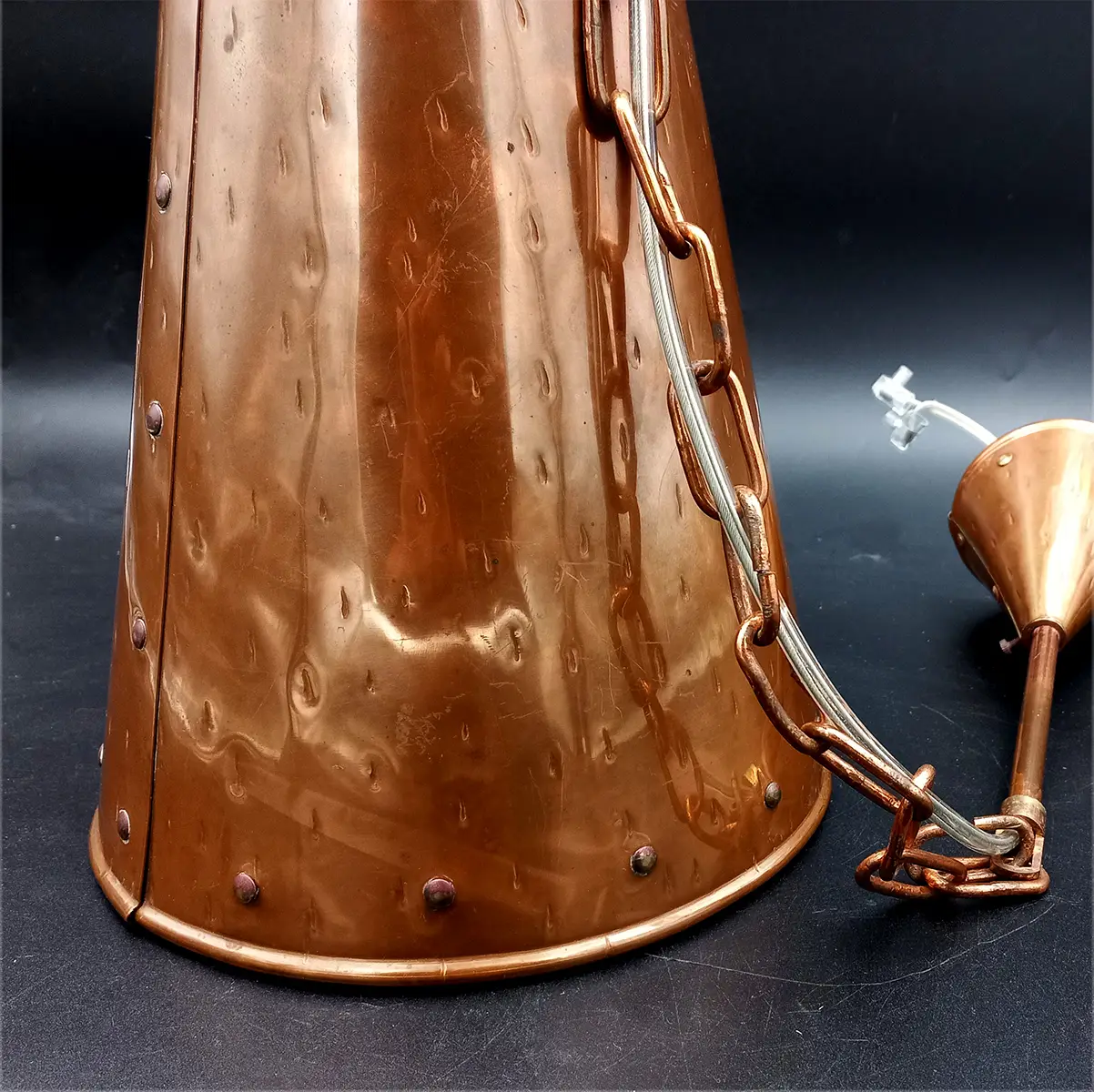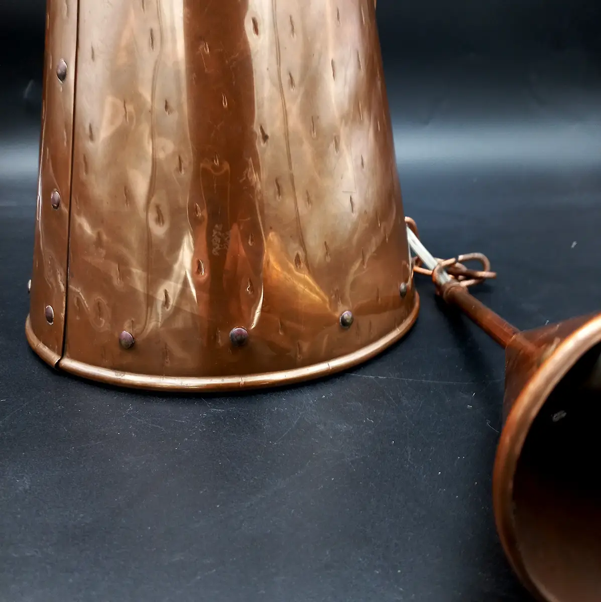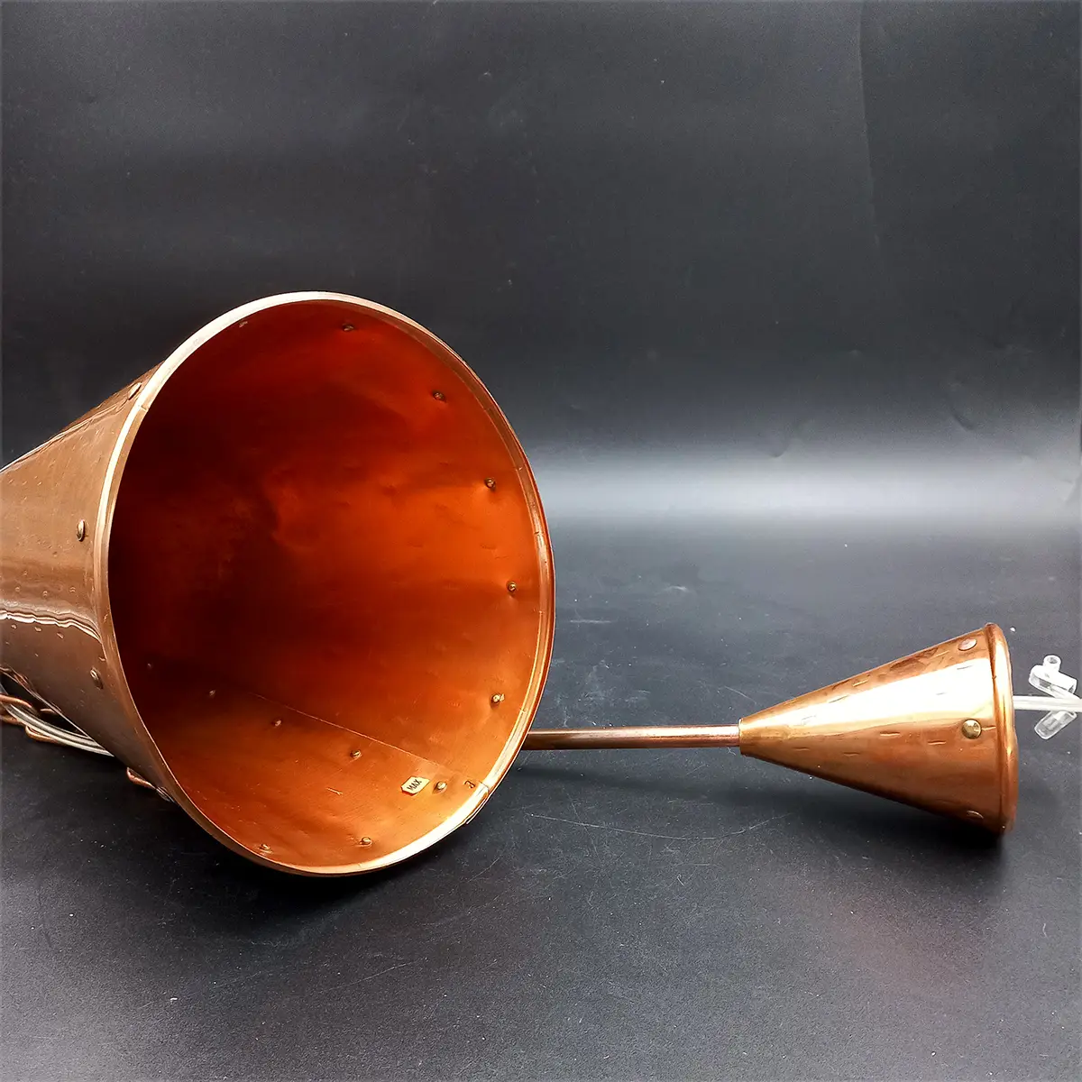 En sjælden og markant pendellampe fra TH. Valentiner, Copenhagen, udført i massiv kobber med nitter og håndhamret overflade. Den koniske form giver et skulpturelt og minimalistisk udtryk, der både fungerer som belysning og som et kunstnerisk objekt i rummet.
