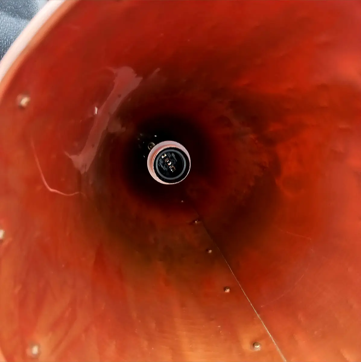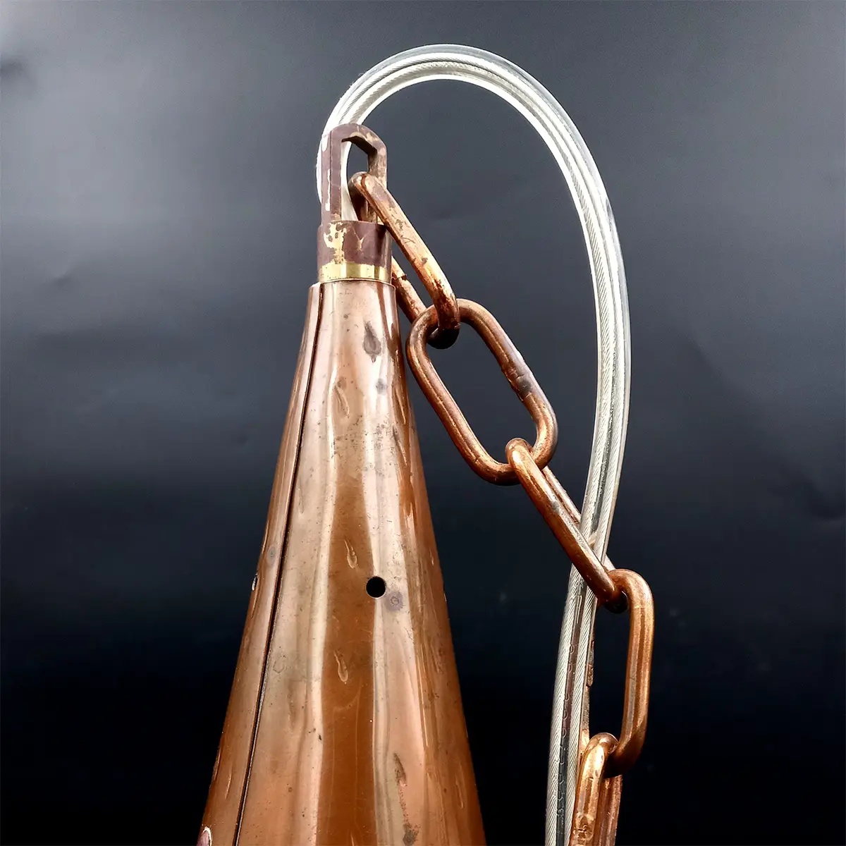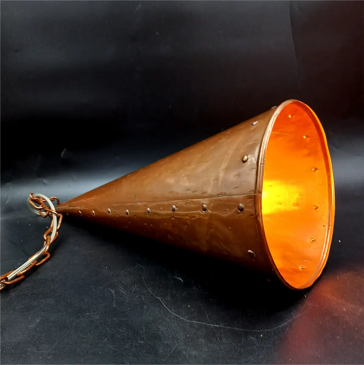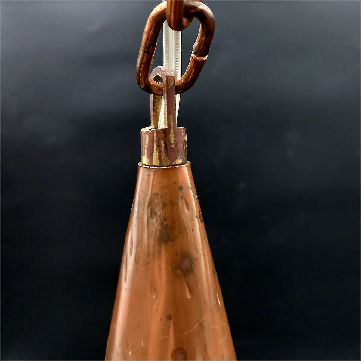 En sjælden og markant pendellampe fra TH. Valentiner, Copenhagen, udført i massiv kobber med nitter og håndhamret overflade. Den koniske form giver et skulpturelt og minimalistisk udtryk, der både fungerer som belysning og som et kunstnerisk objekt i rummet.