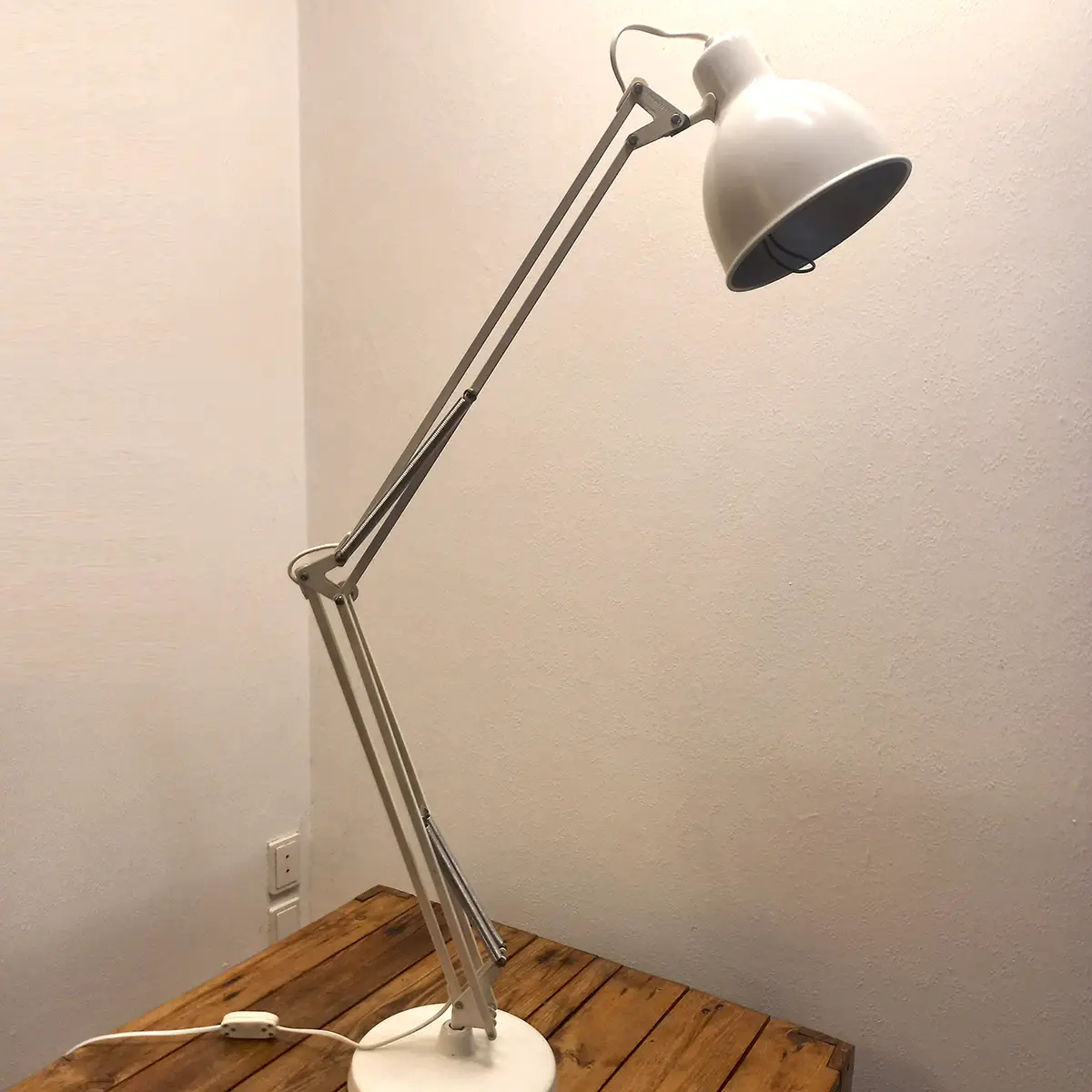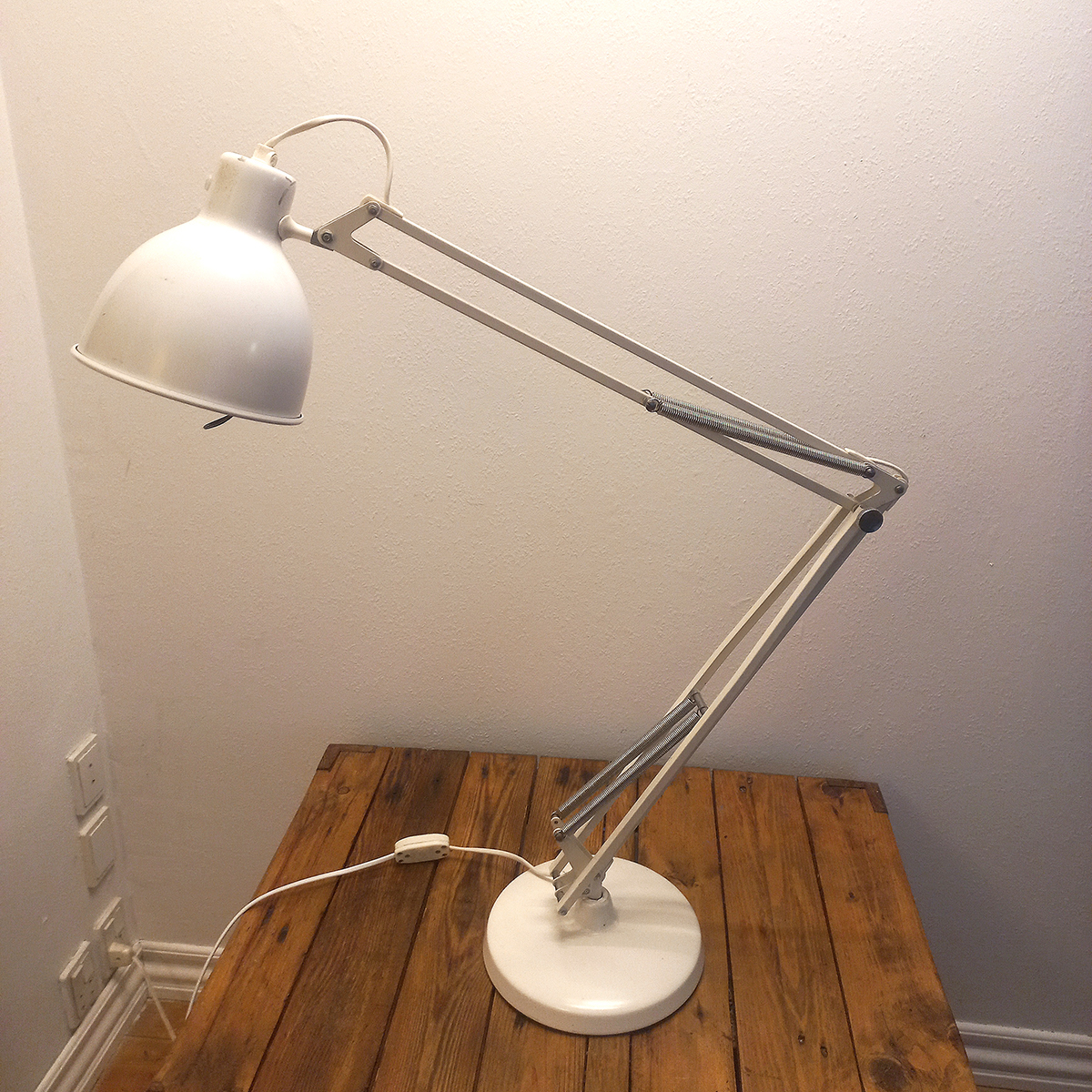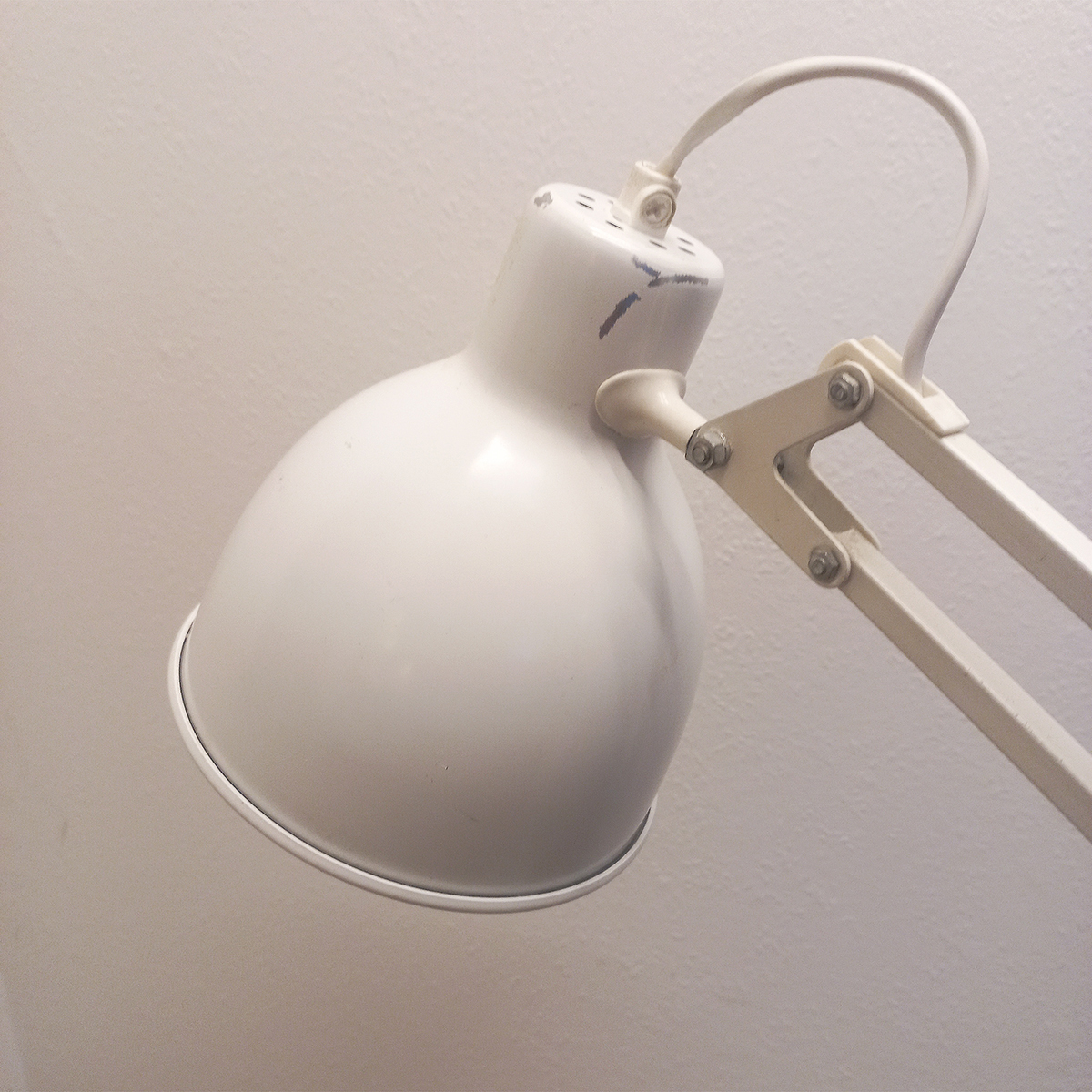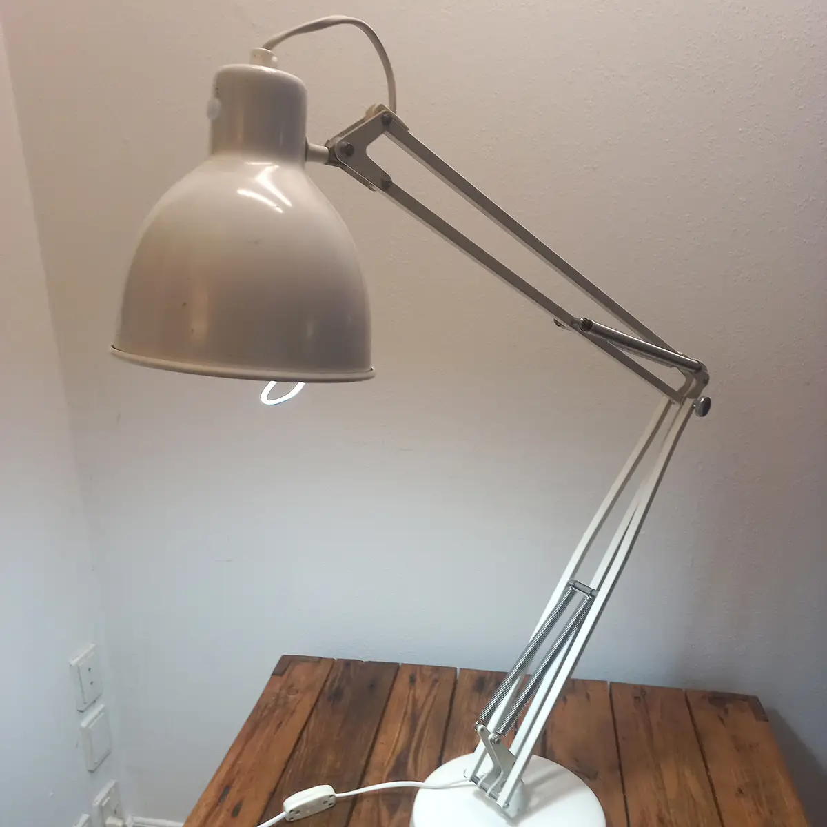 Lampen fremstår med tydelige, ærlige brugsspor og patina, svarende til alder og anvendelse, men uden buler eller deformationer. Mekanik og fjedre fungerer korrekt, og armene holder position, som de skal.