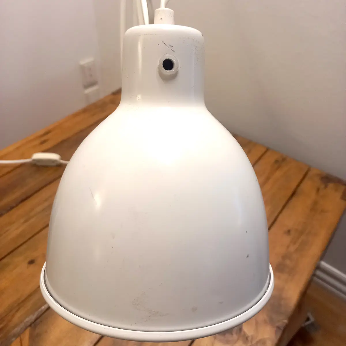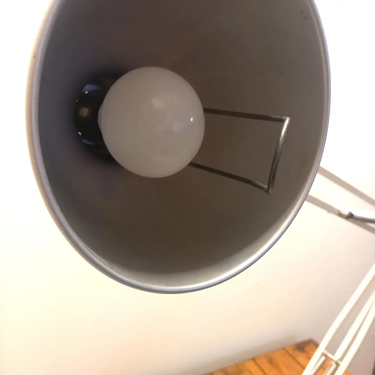 Elektriciteten er gennemgået, og lampen er opdateret med gennemgangsafbryder som funktionel erstatning for den oprindelige tænd/sluk-knap. Ændringen er praktisk og reversibel, men betyder, at lampen ikke står 100 % original – hvilket er afspejlet i prissætningen.