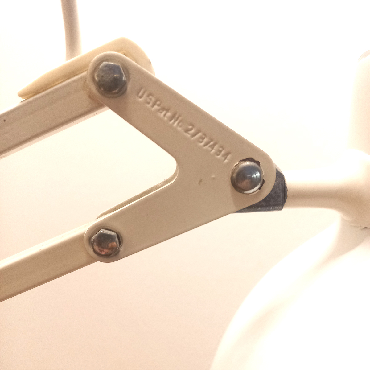 Det særligt bemærkelsesværdige ved dette eksemplar er den originale tunge bordfod på ca. 5 kg, som er langt sjældnere end den almindelige bordklemme. Den tunge fod giver både øget stabilitet og en mere selvstændig, skulpturel tilstedeværelse på bordet – og er i dag eftertragtet blandt samlere.