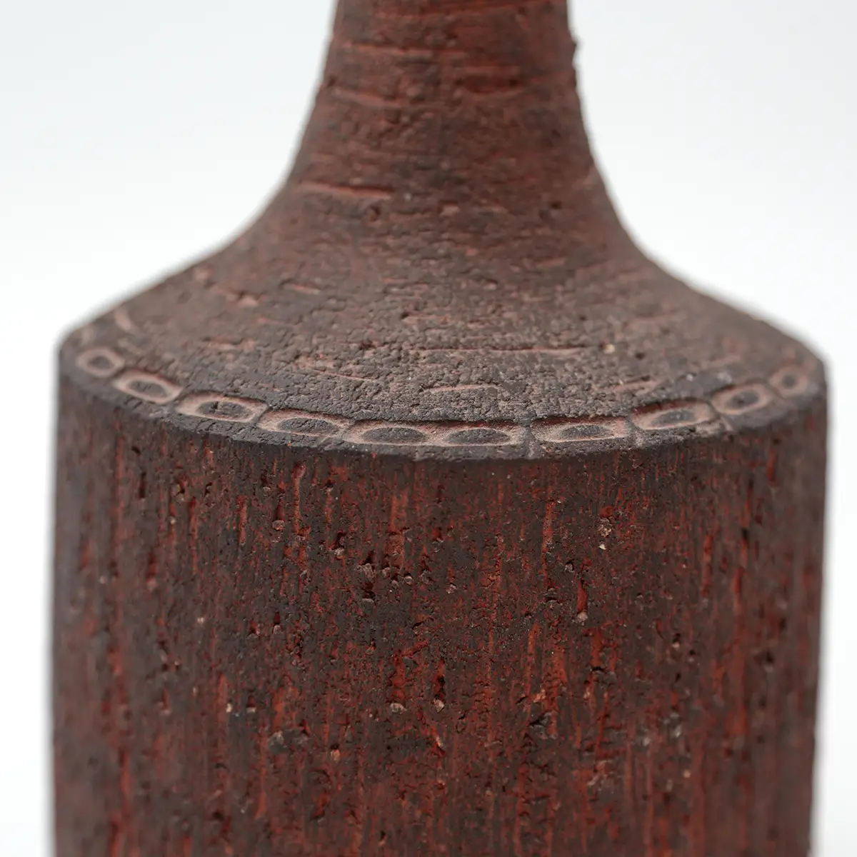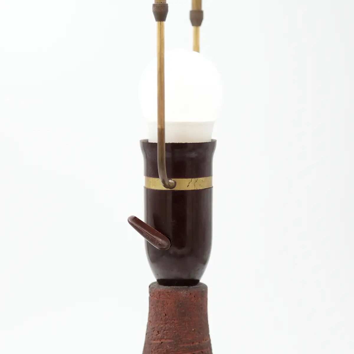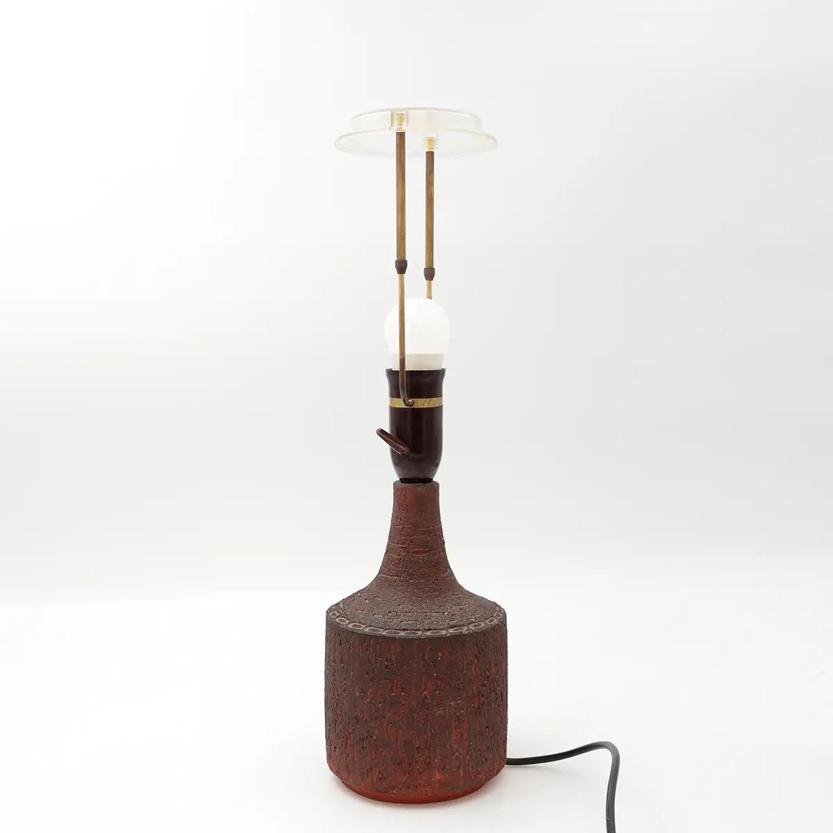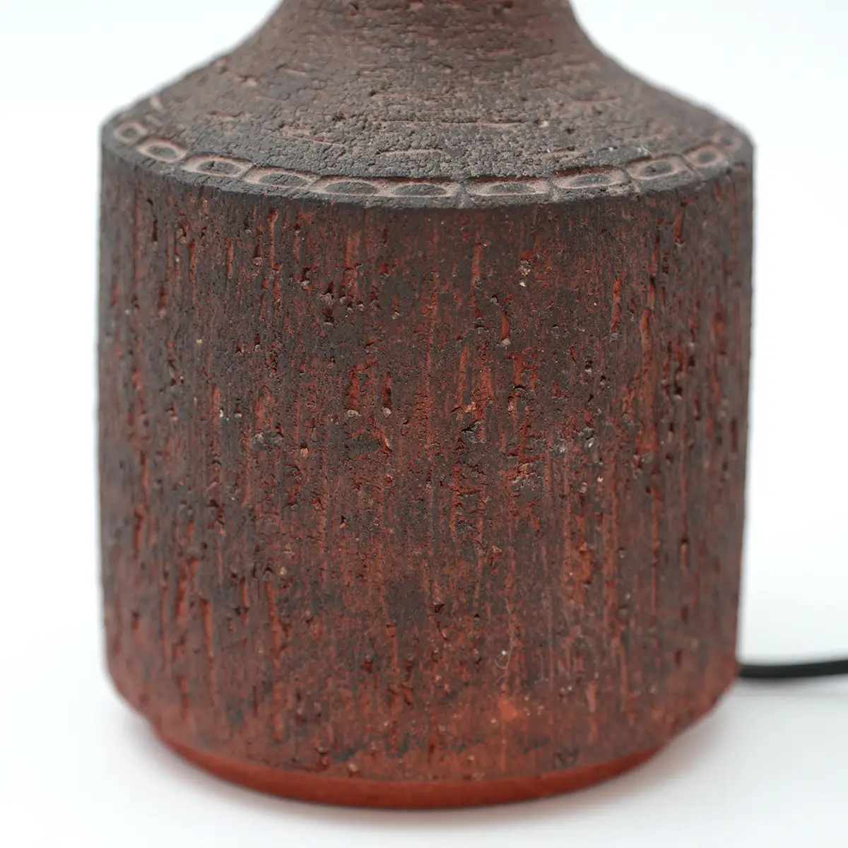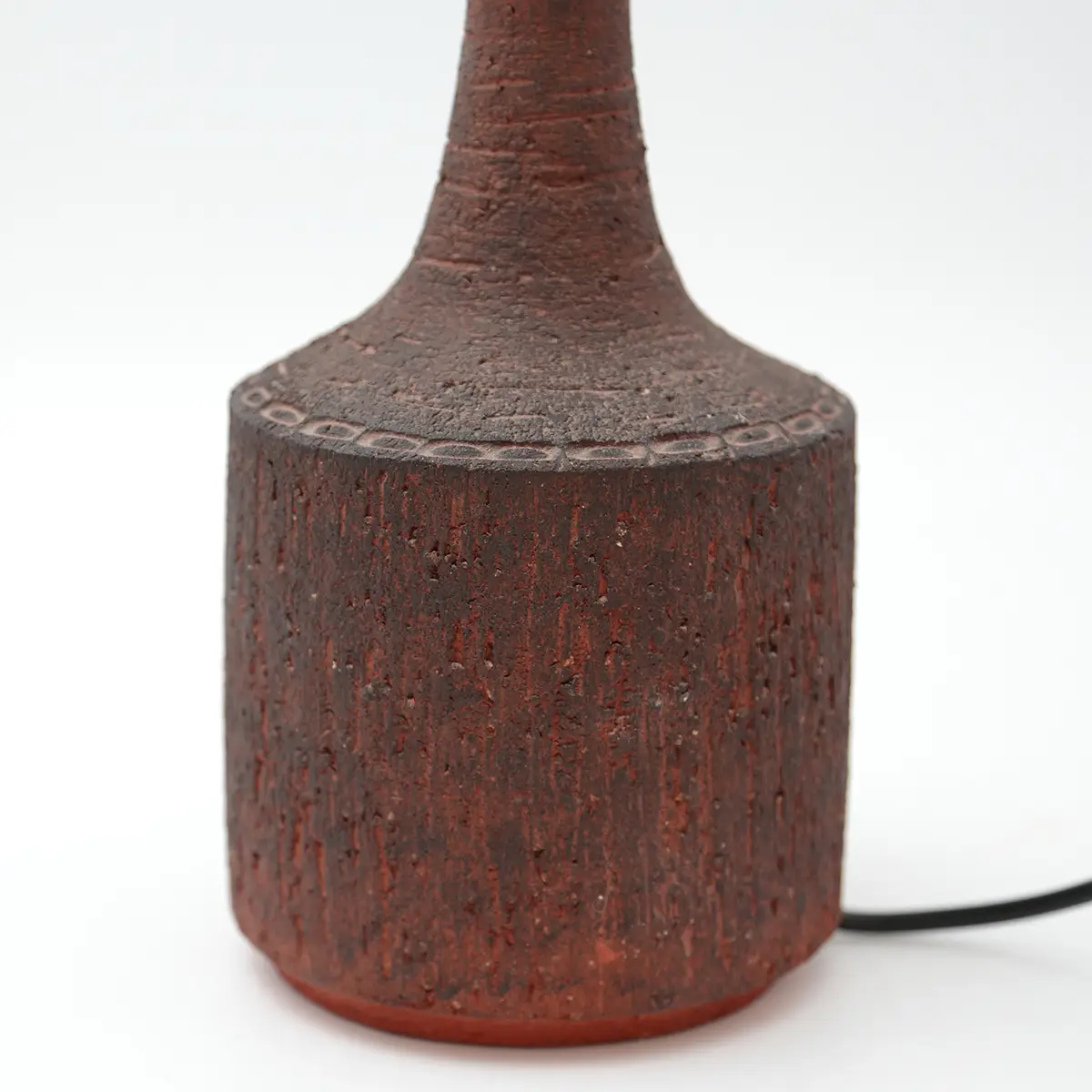 Den dybe rødbrune glasur med mørkere nuancer og den tydelige struktur giver lampen et næsten skulpturelt udtryk. En lampe der ikke bare lyser op, men tilfører rummet karakter og varme.