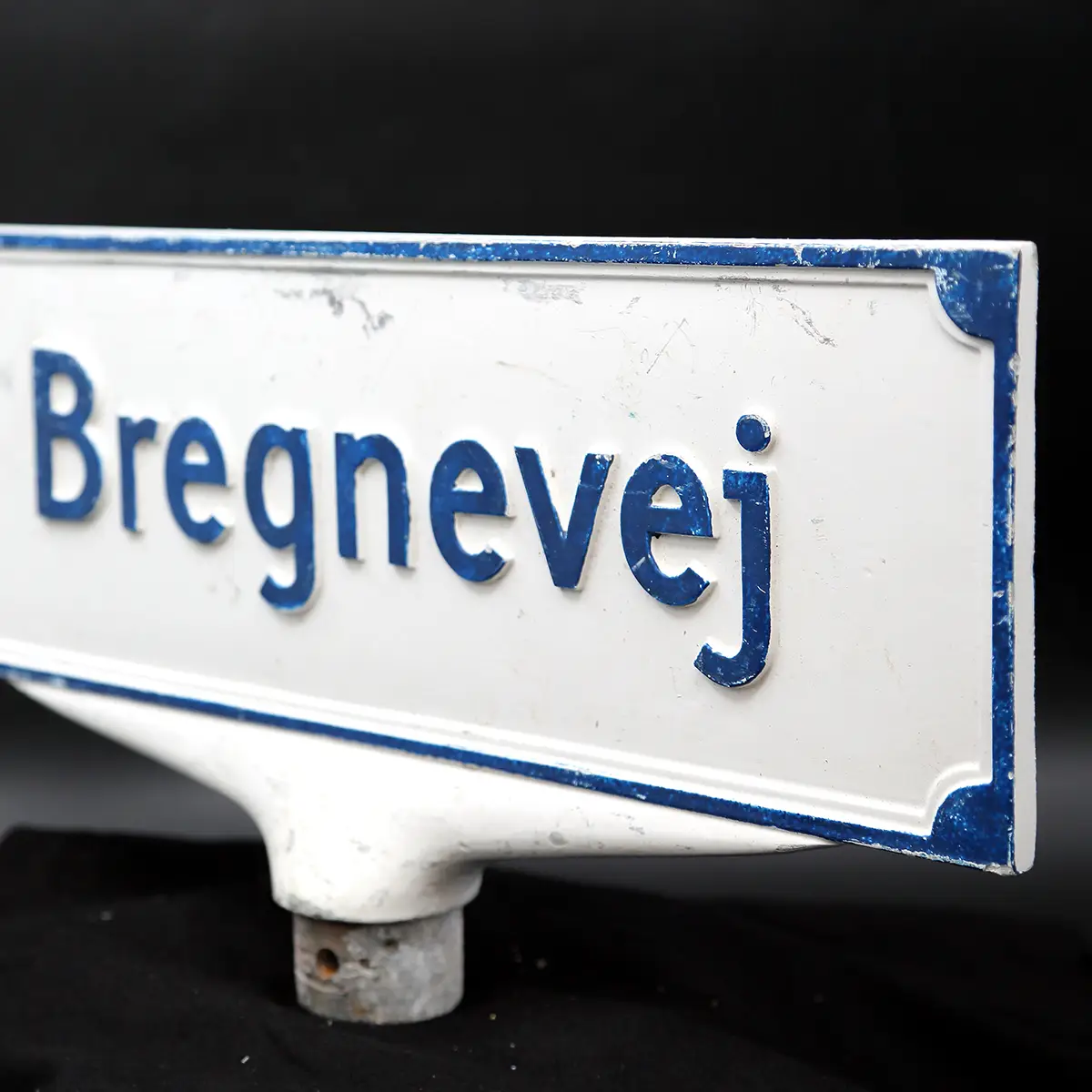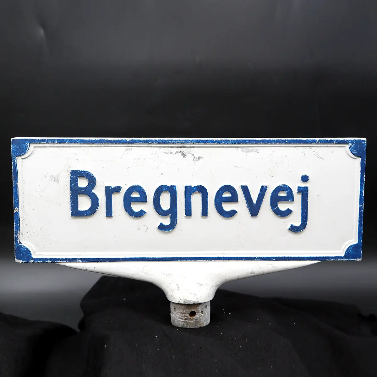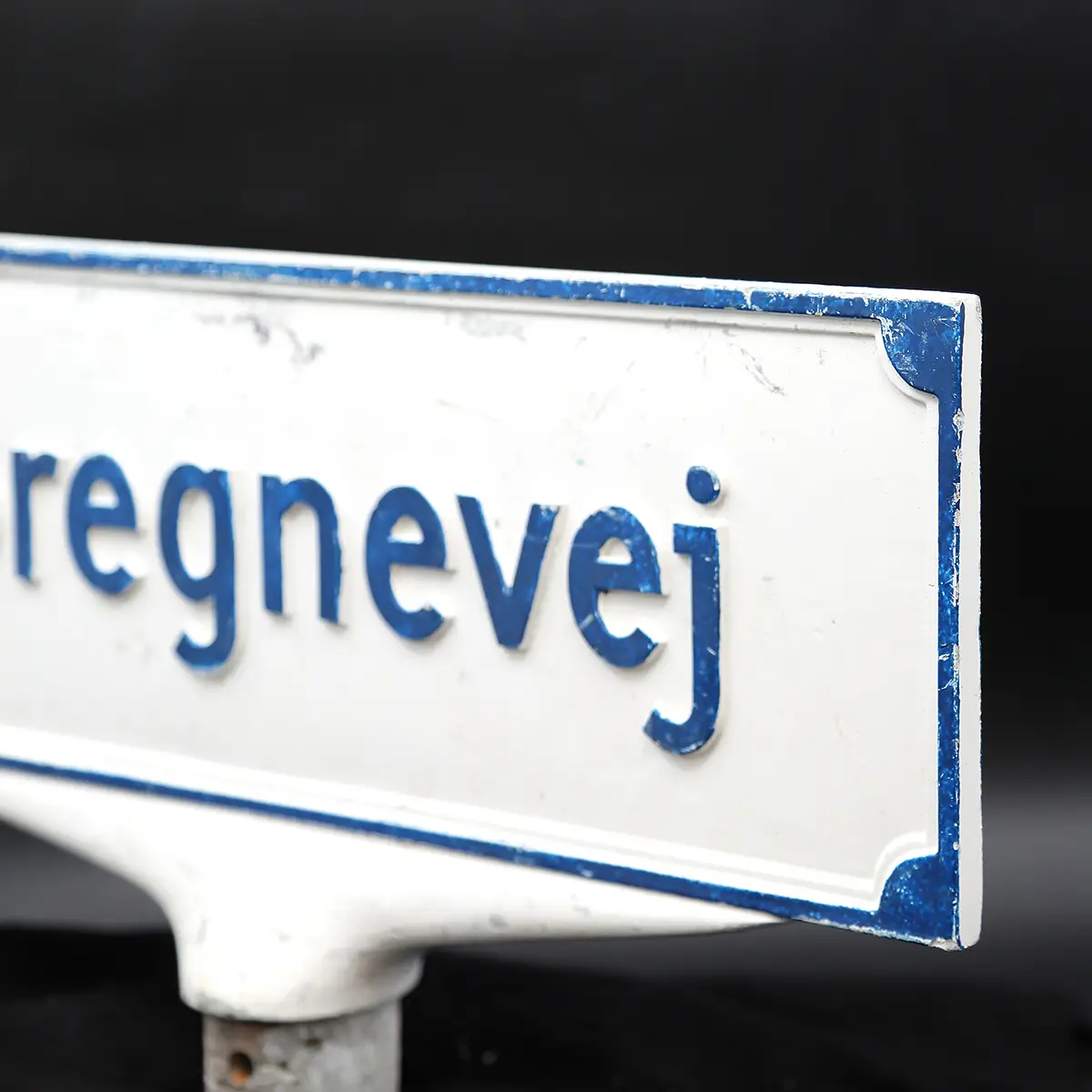 Originalt tosidet dansk vejskilt i støbt aluminium med autentisk patina fra Roskilde.Vintage dansk vejskilt – “Bregnevej”