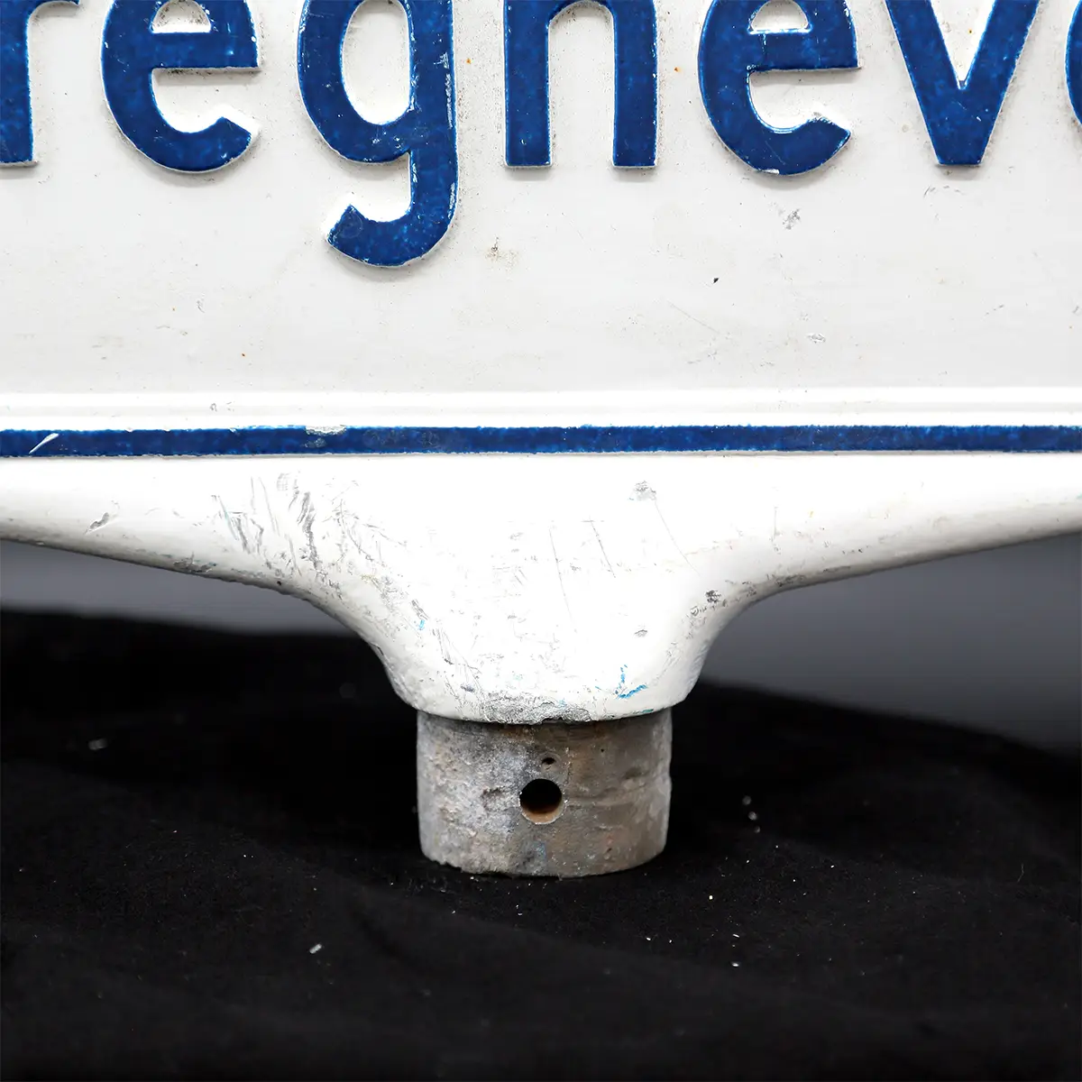 Skiltet har ægte og tydelig patina efter mange års udendørs brug. Overfladen bærer spor af vind og vejr, hvilket giver et råt, autentisk og industrielt udtryk. Dette er ikke dekorativ reproduktion, men et originalt stykke offentlig infrastruktur med dokumenteret oprindelse.