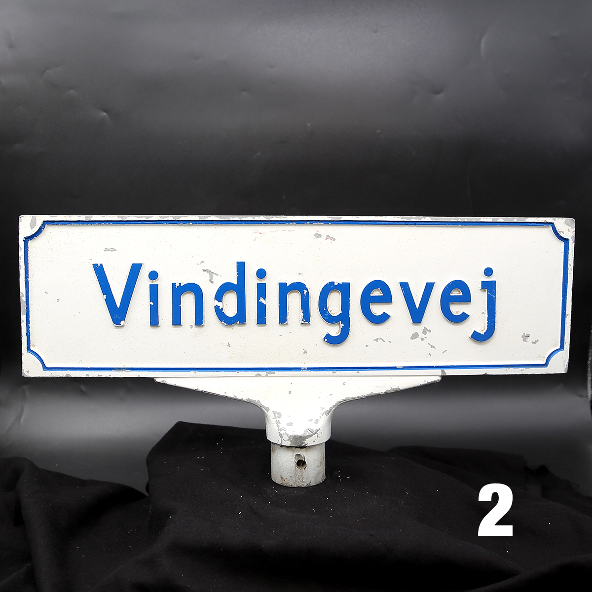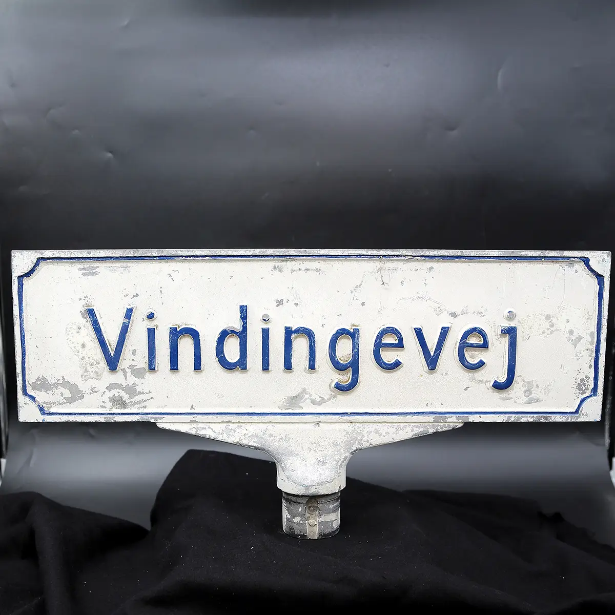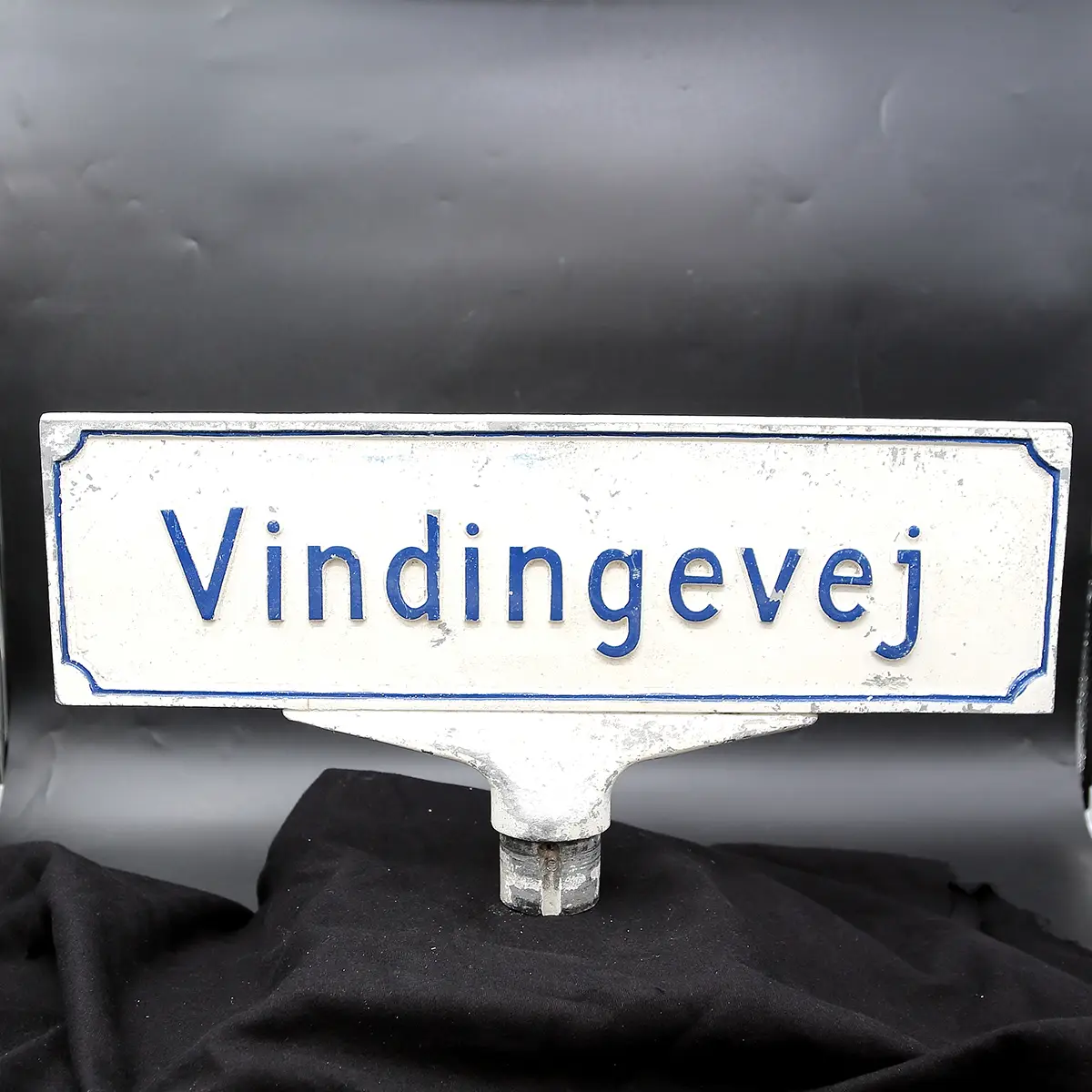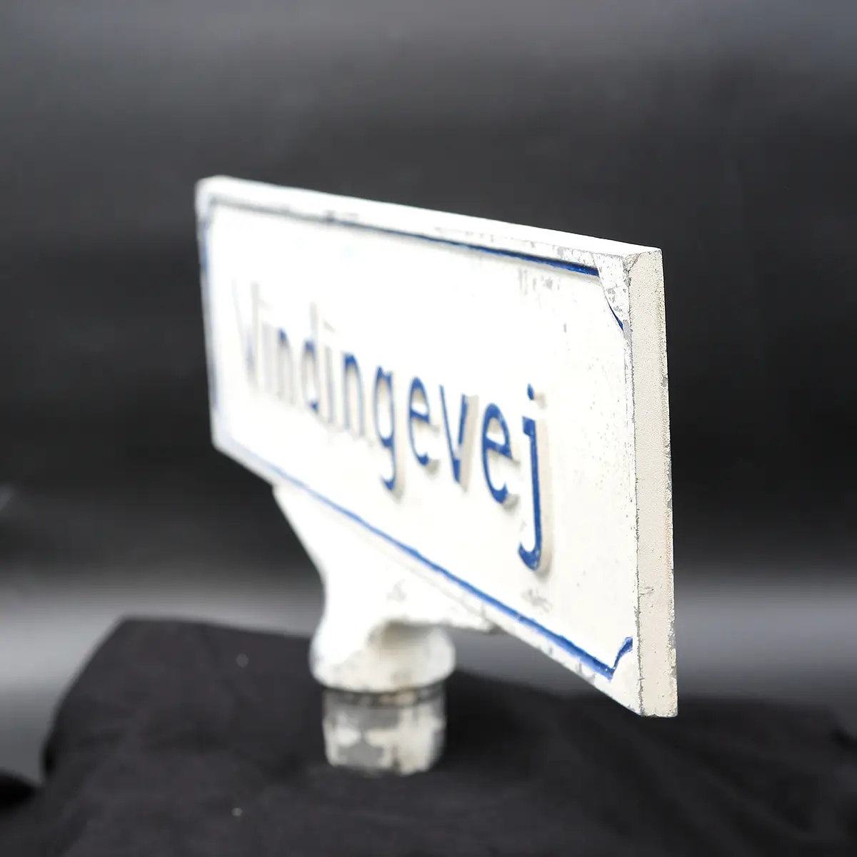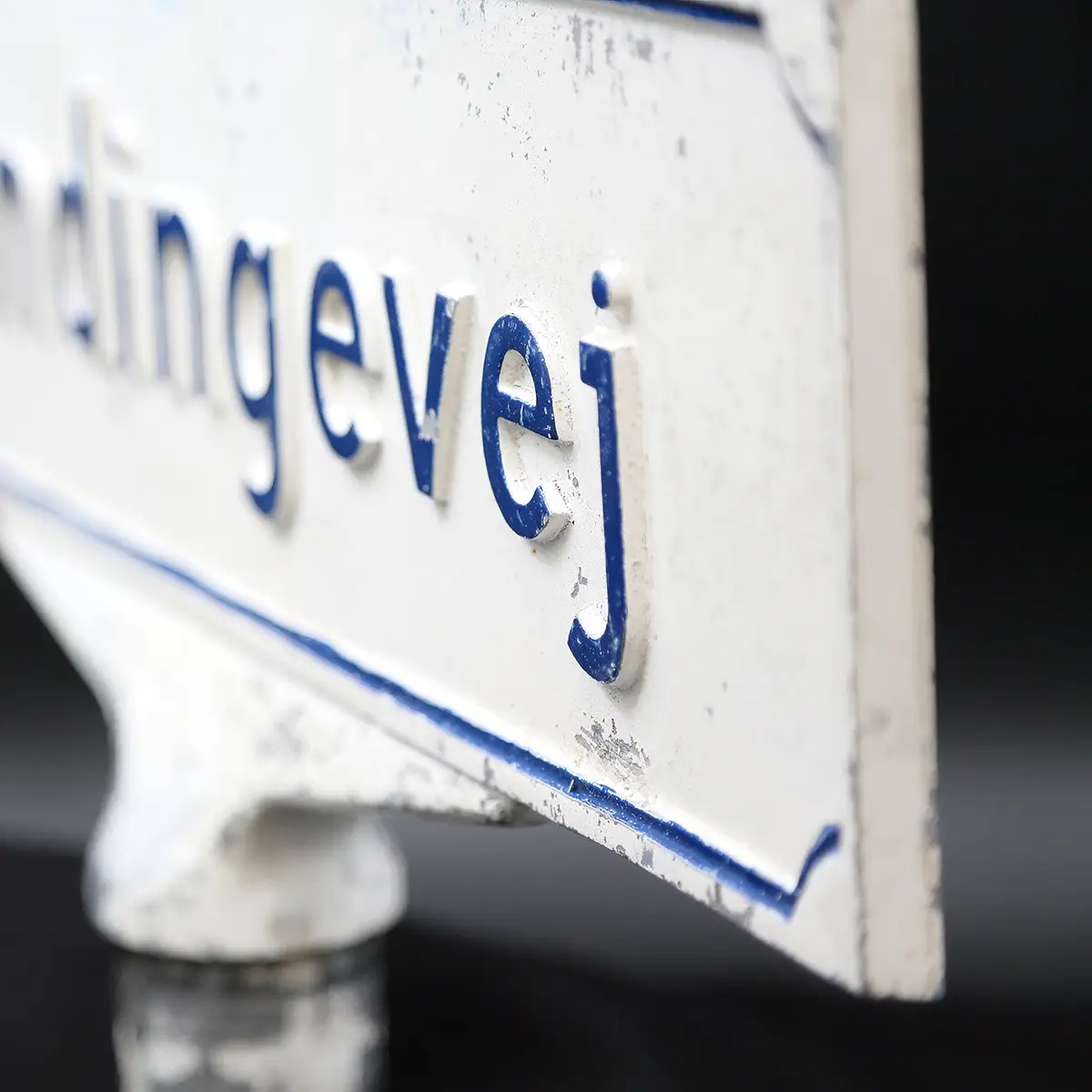 Originalt, tosidet dansk vejskilt i støbt aluminium med fremhævede bogstaver i klassisk kommunal skrifttype. Skiltet stammer fra et boligkvarter i Roskilde, hvor samtlige vejskilte blev udskiftet samlet – et afsluttet stykke dansk byrumshistorie.