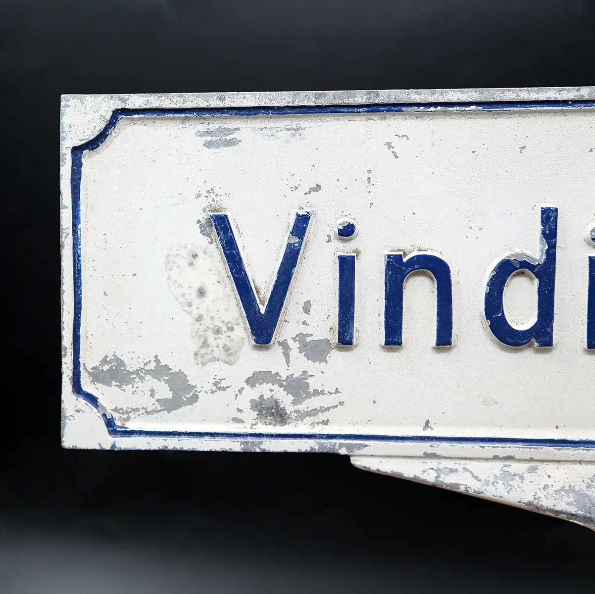 Skiltet er tosidet, hvor hver side har sit eget udtryk. Den ene side fremstår mere slidt end den anden, hvilket giver mulighed for at vælge den side, der passer bedst til display og indretning.