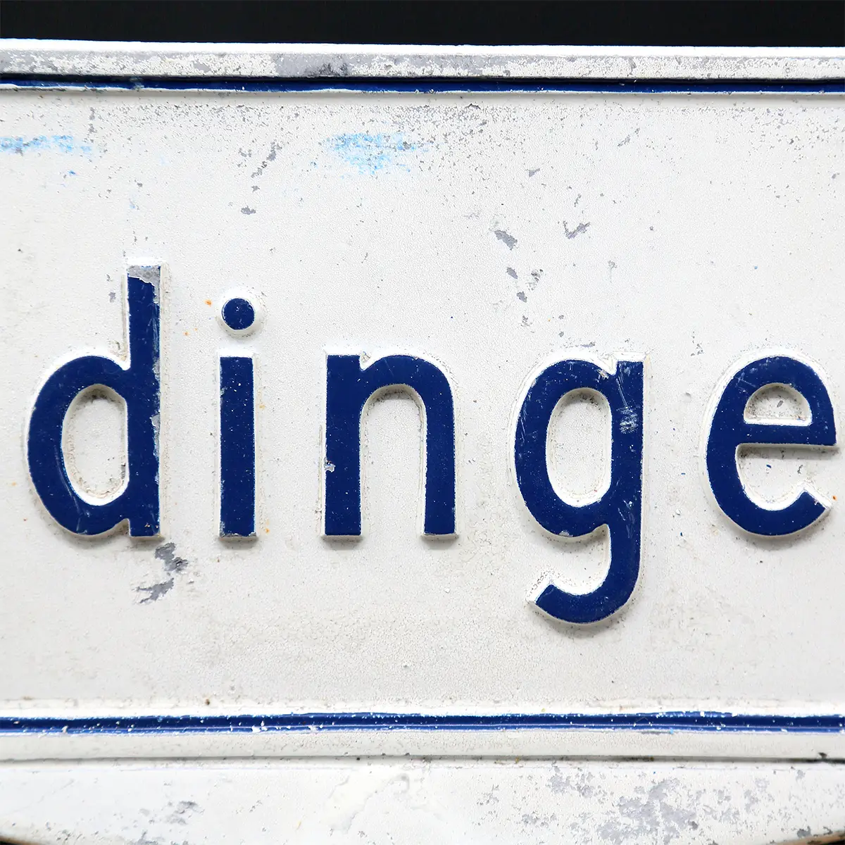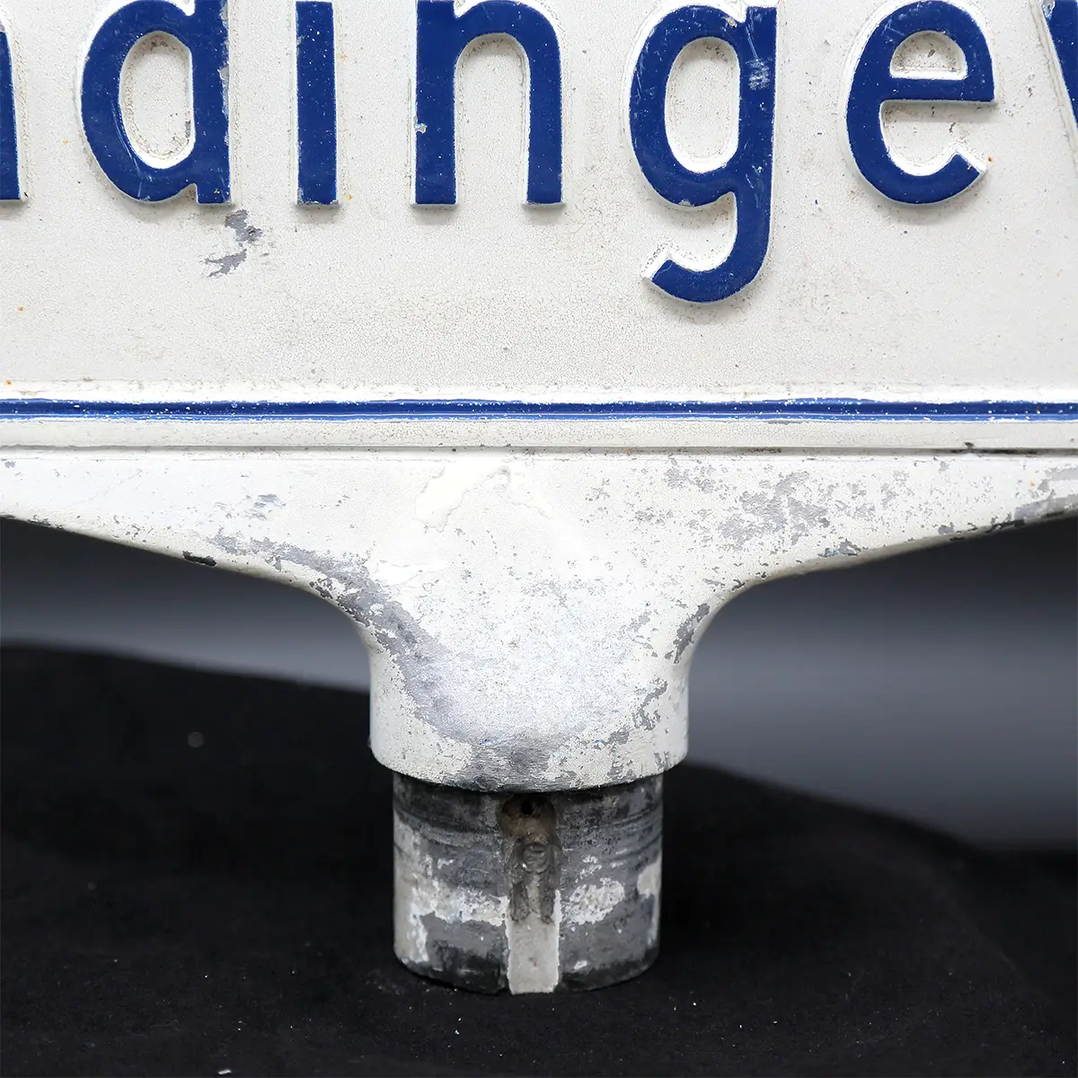 Skiltet har ægte og tydelig patina efter mange års udendørs brug. Overfladen bærer spor af vind og vejr, hvilket giver et råt, autentisk og industrielt udtryk. Dette er ikke dekorativ reproduktion, men et originalt stykke offentlig infrastruktur med dokumenteret oprindelse.