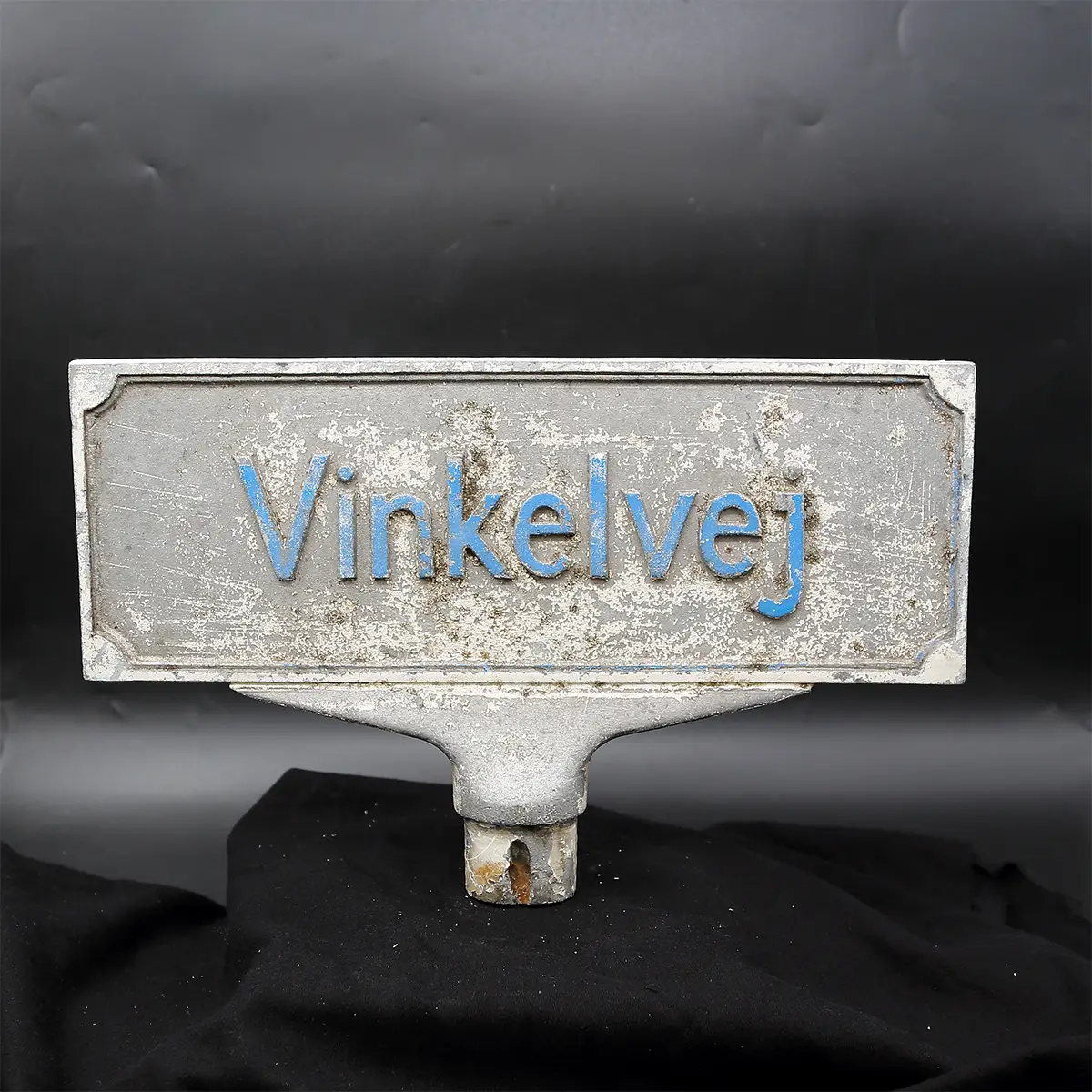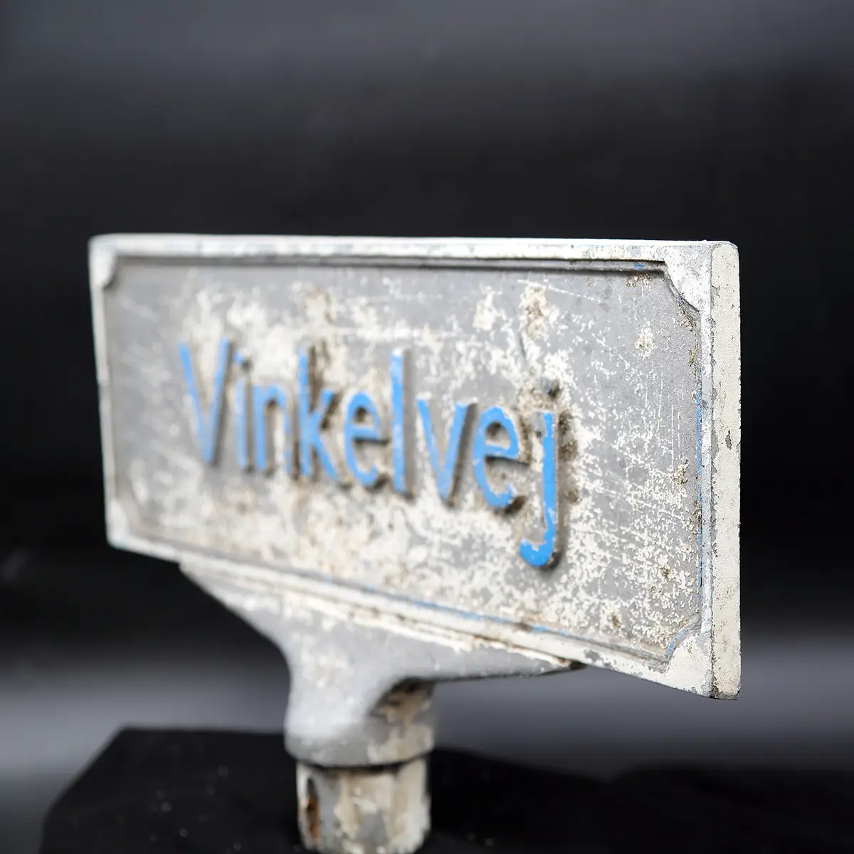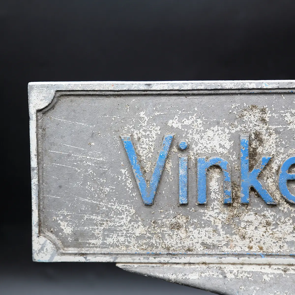 Originalt tosidet dansk vejskilt i støbt aluminium med autentisk patina fra Roskilde.Vintage dansk vejskilt – “Vinkelvej”