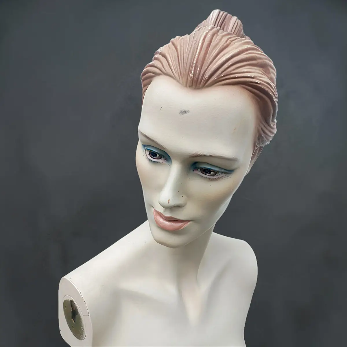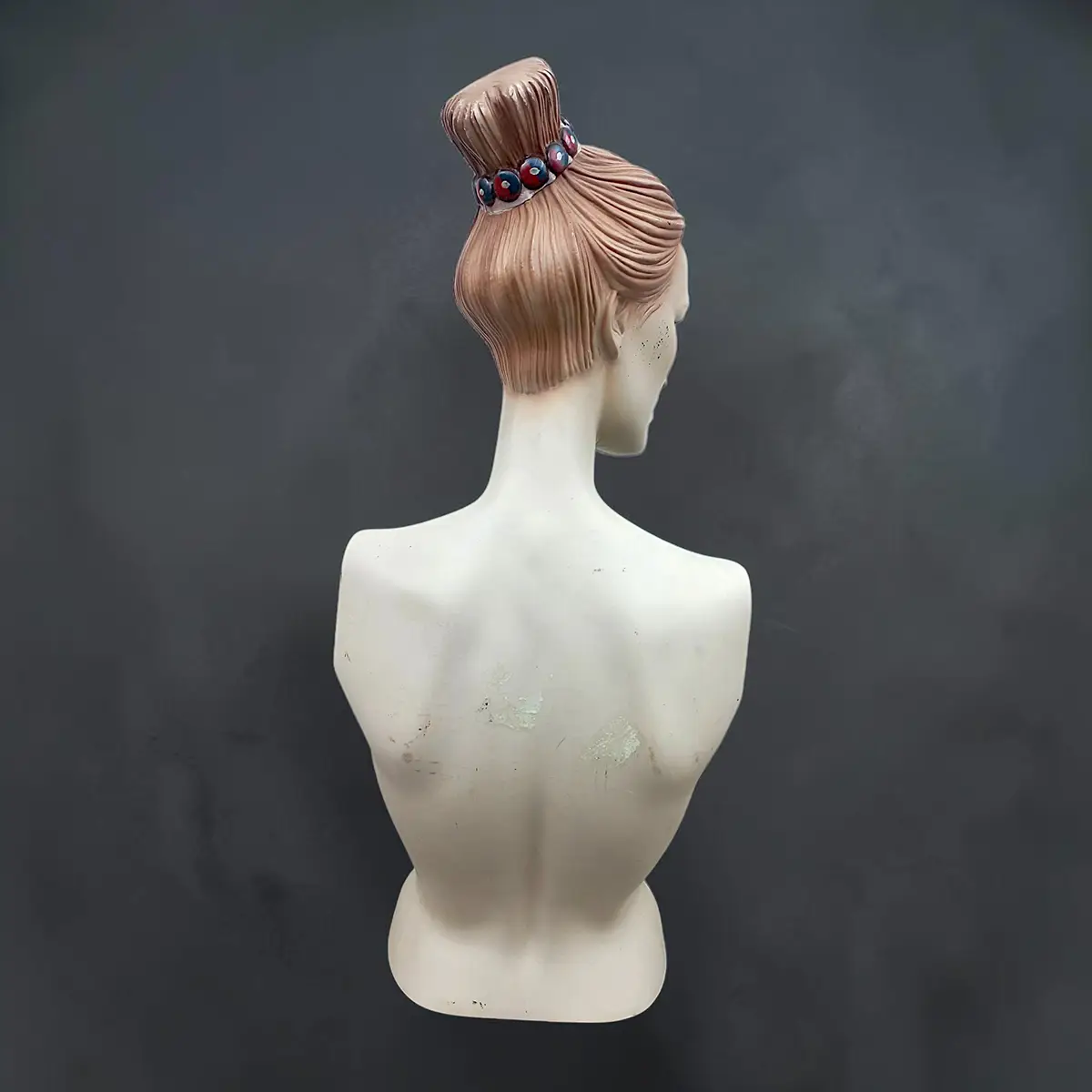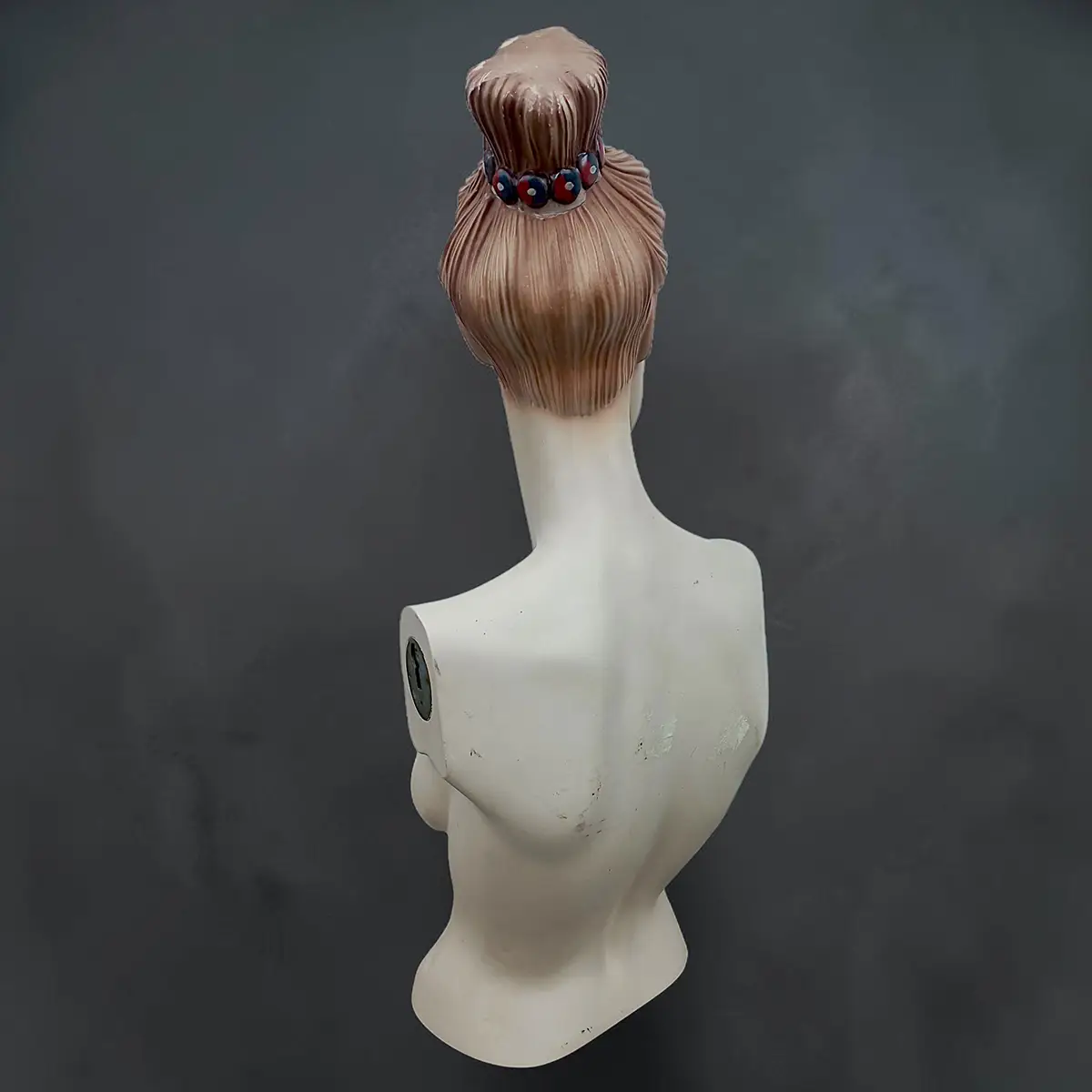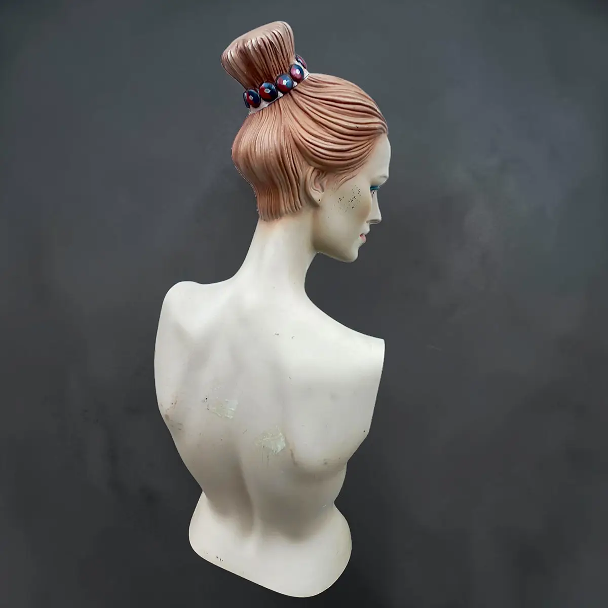 Elegant og karakterfuld vintage mannequin torso med hoved, udført i klassisk butikstil med slank silhuet og fint modellerede ansigtstræk. Figuren fremstår med en smuk patineret overflade og en rolig, næsten skulpturel udstråling, der gør den oplagt som dekorativt element i både butik, atelier eller bolig.