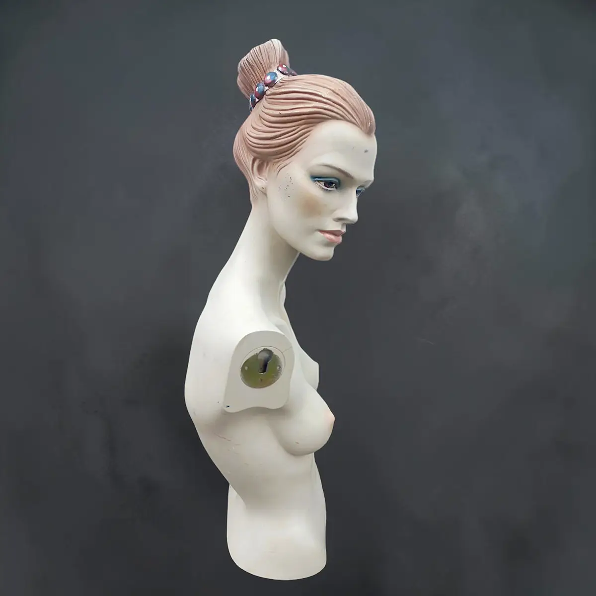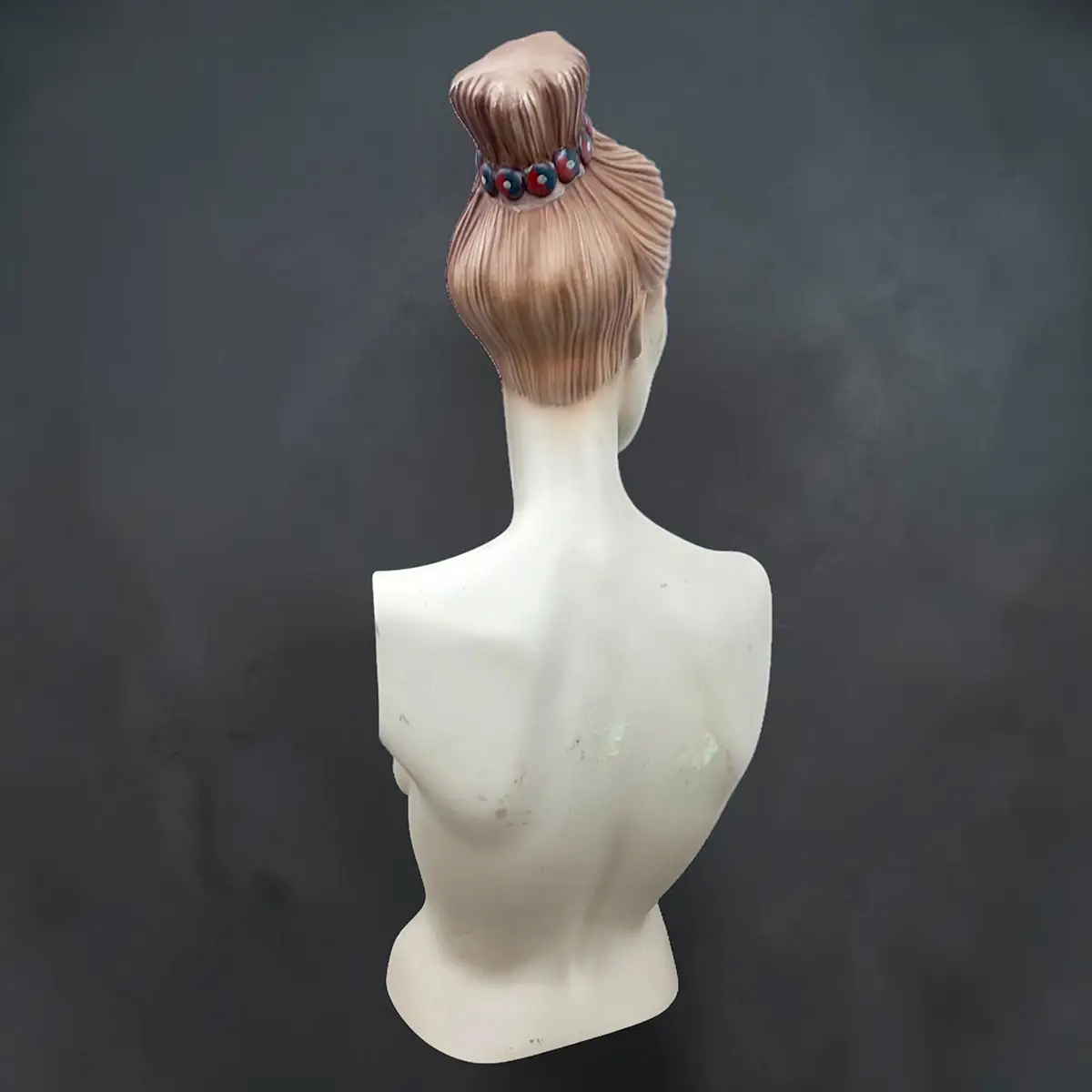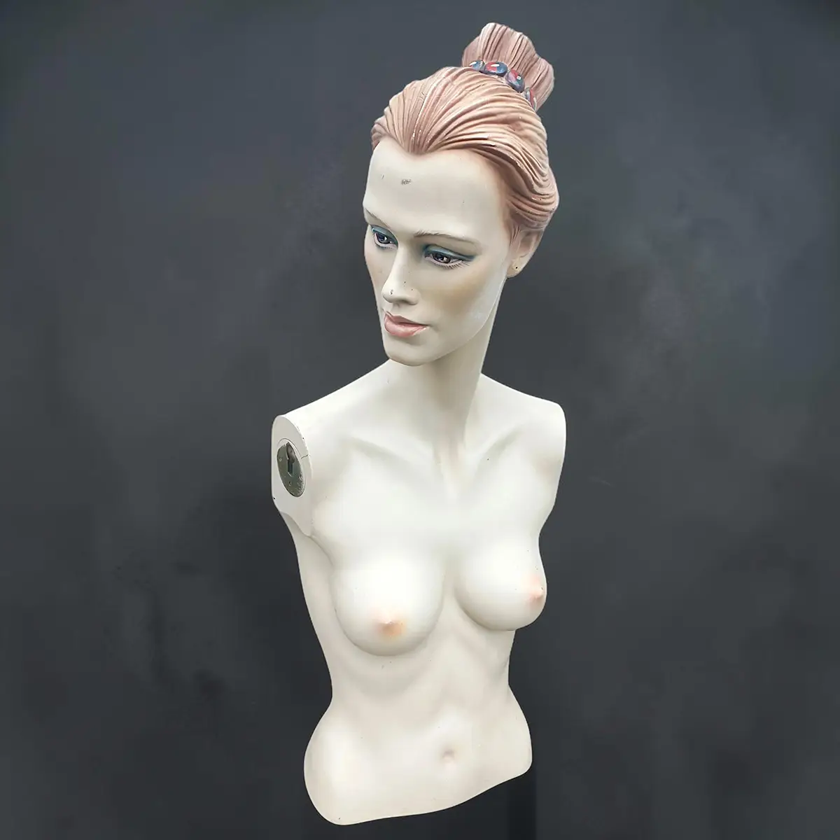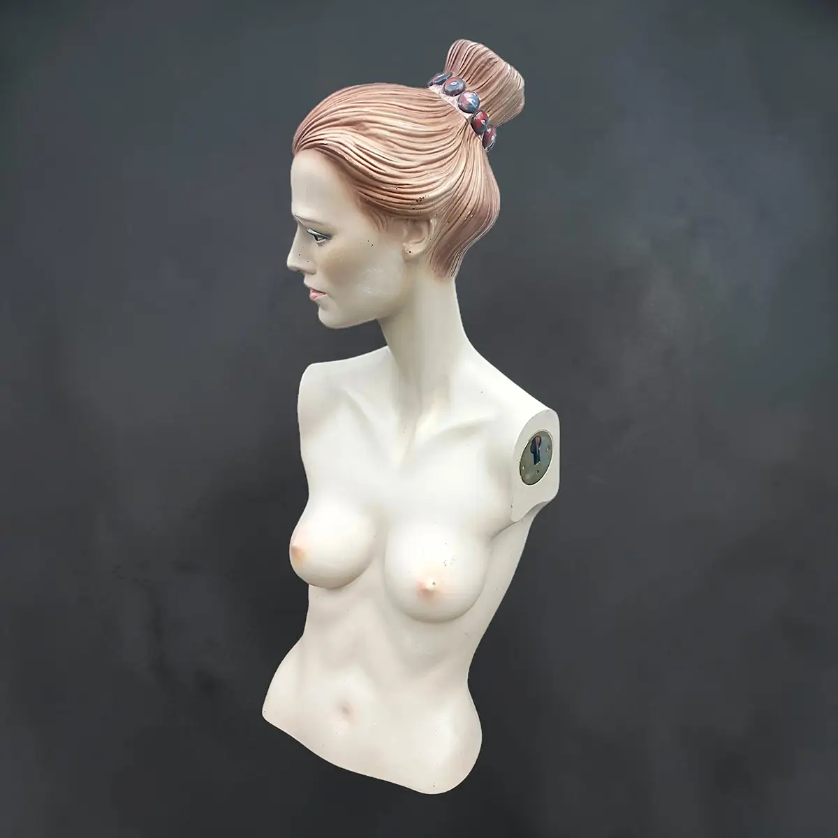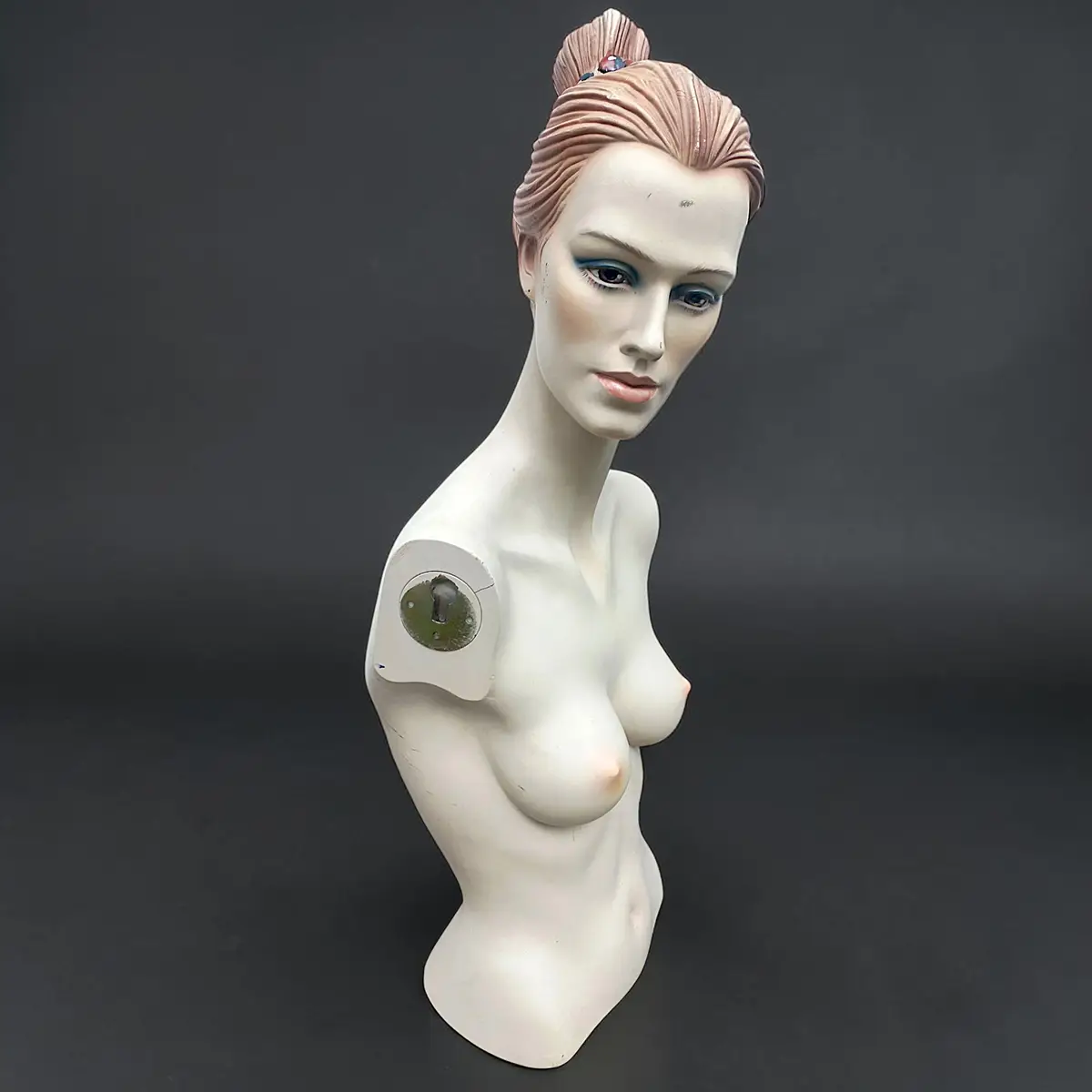 Elegant og karakterfuld vintage mannequin torso med hoved, udført i klassisk butikstil med slank silhuet og fint modellerede ansigtstræk. Figuren fremstår med en smuk patineret overflade og en rolig, næsten skulpturel udstråling, der gør den oplagt som dekorativt element i både butik, atelier eller bolig.